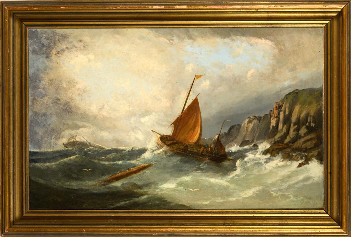 Lifeboat near the steep rocky coast not far from the sinking ship in the sunshine. Doubled canvas.