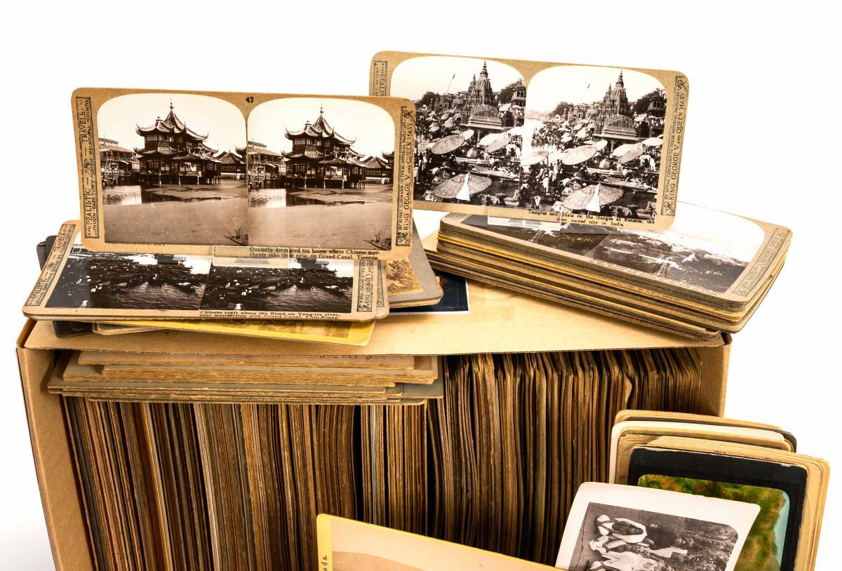 Black lacquered and ornamentally engraved graphoscope viewer, also for stereo photos. Slightly warped, some signs of wear / 2 walnut stereoscopes with sliding photo holders. 1 handle replaced. / Large number of stereo photographs (China, Japan, India, Africa, England, America etc., some folkloristic). / 3 small red photo albums with some loosely inserted photos: "Rhein", "Trier", "Ahrtal". 2 small leather-covered albums with photos (Strasbourg, Rhineland and Austria, Switzerland, Italy, Denmark, partly after paintings/lithographs, partly dated from 1864). Plus numerous loose photos/view cards of various sizes. Signs of age/use.