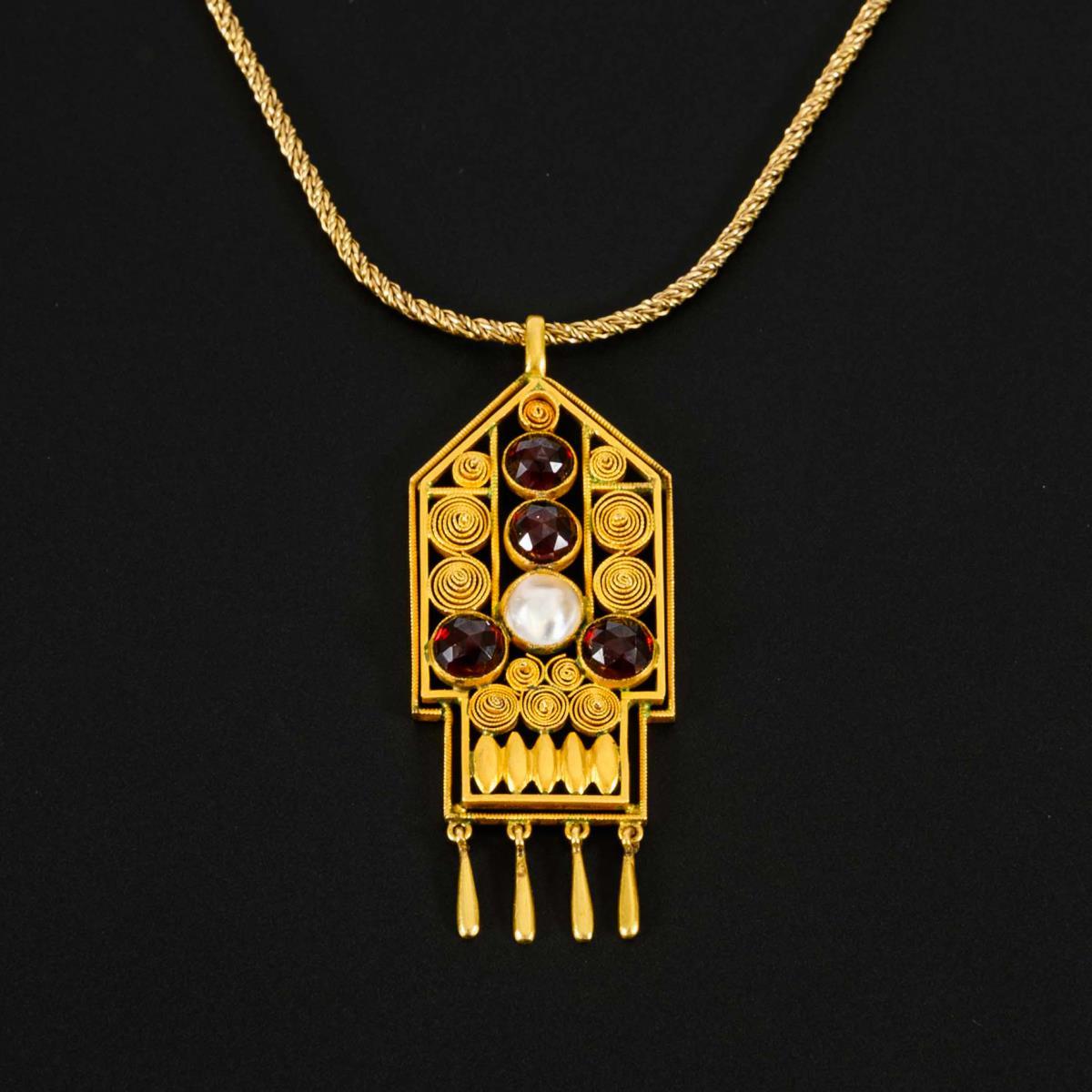 Geometrically designed pendant with bezel-set garnets, mother-of-pearl inlay and spiral decoration, on cord chain with ring spring clasp.