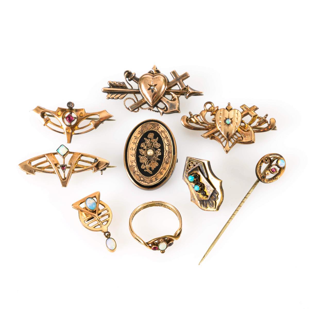 9 pieces of Art Nouveau jewelry.