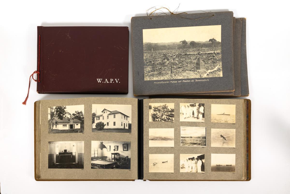 2 photo albums by Paul Lieberenz (1896 - 1954). Extensive documentation on the "West African Plantation Company Victoria (WAPV)", which was involved in the production of cocoa, bananas, palm oil and rubber. Factory and plantation photos, as well as many private photos with people. Enclosed four-page text of the time. Together approx. 480 photos in 2 albums and partly loose on cardboard plus photos on gray cards, single photo in paper sleeve.
