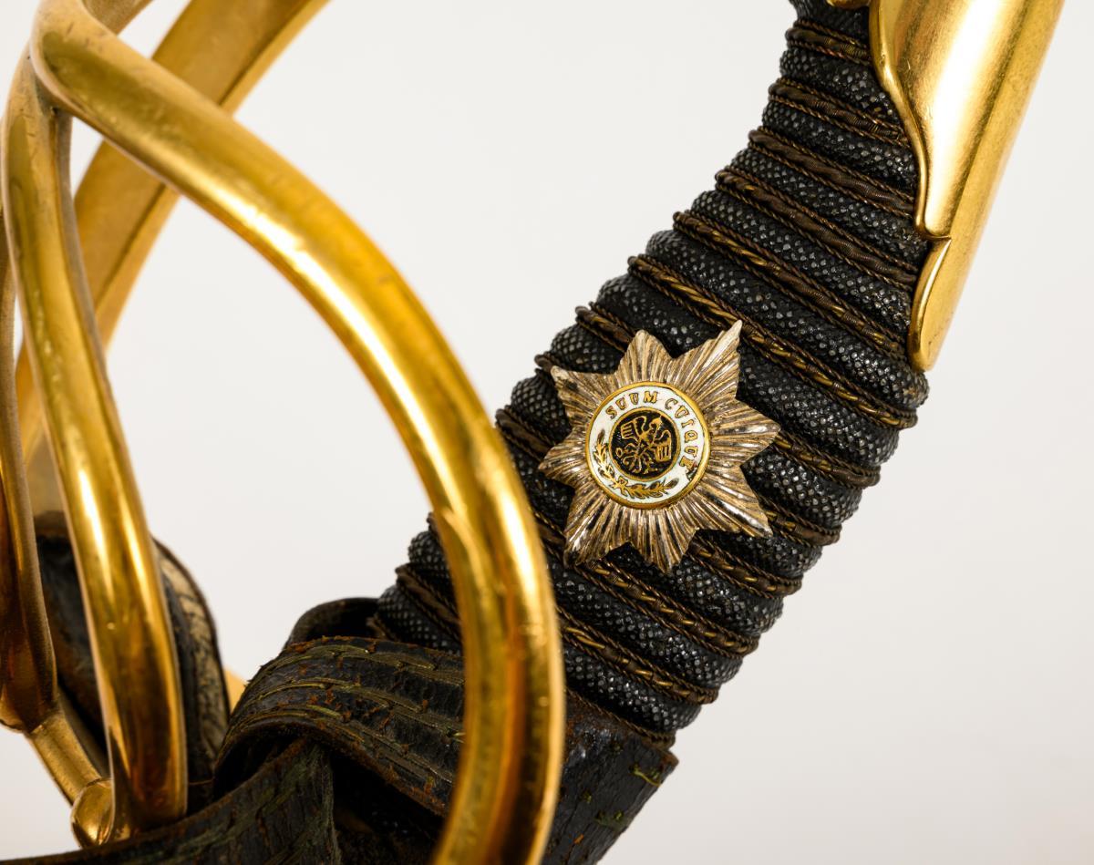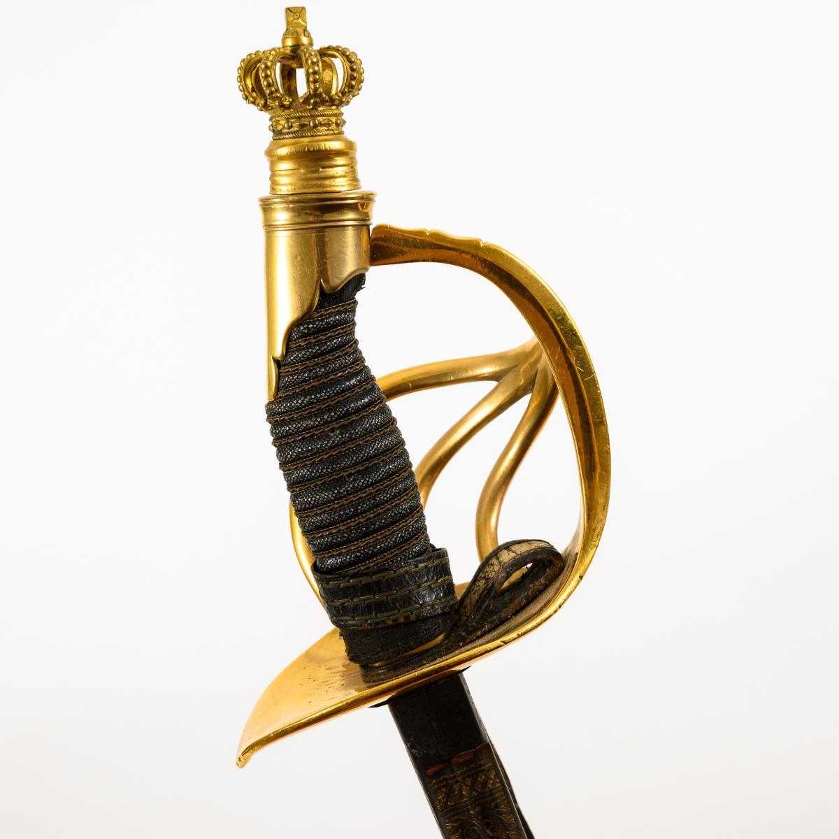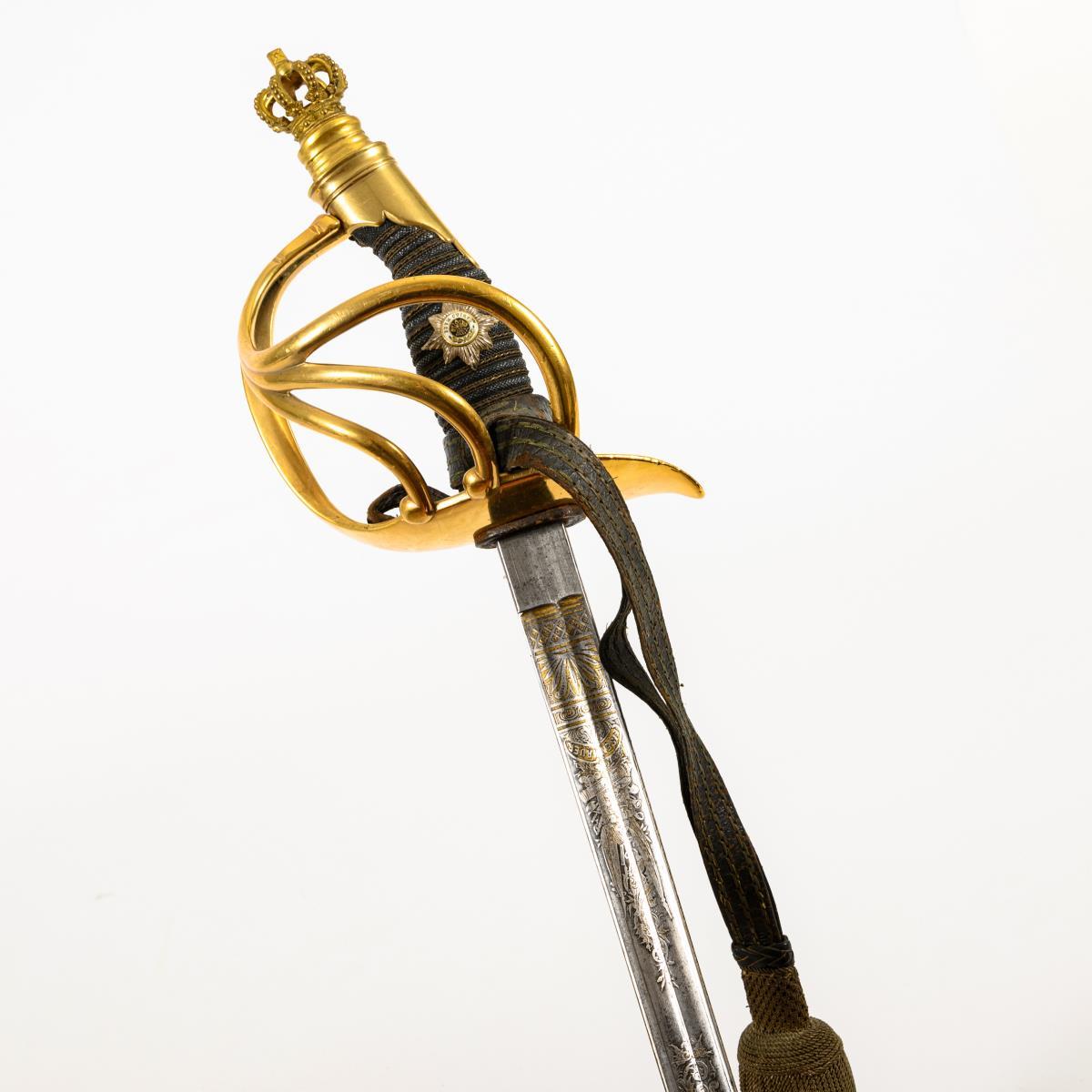 Straight, richly etched blade "Eisenhauer Damascus steel", with remnants of gilding. Oval guard plate and four-bar basket. Crown at the pommel end mounted later. Leather loop for thumb and lanyard. Bright metal scabbard with two suspension rings and traces of repair and suspension.