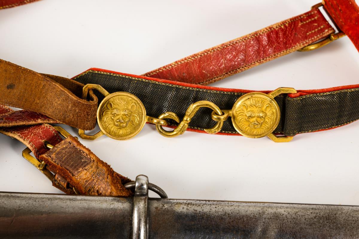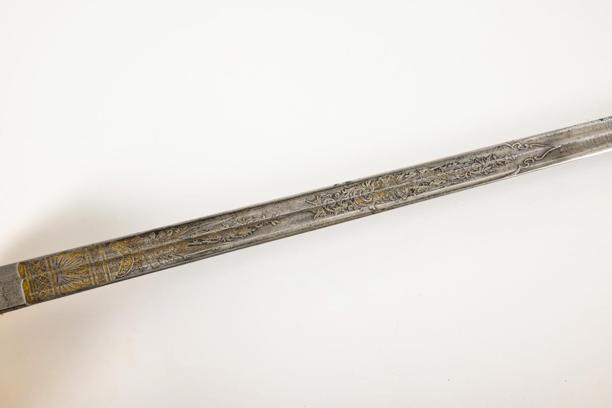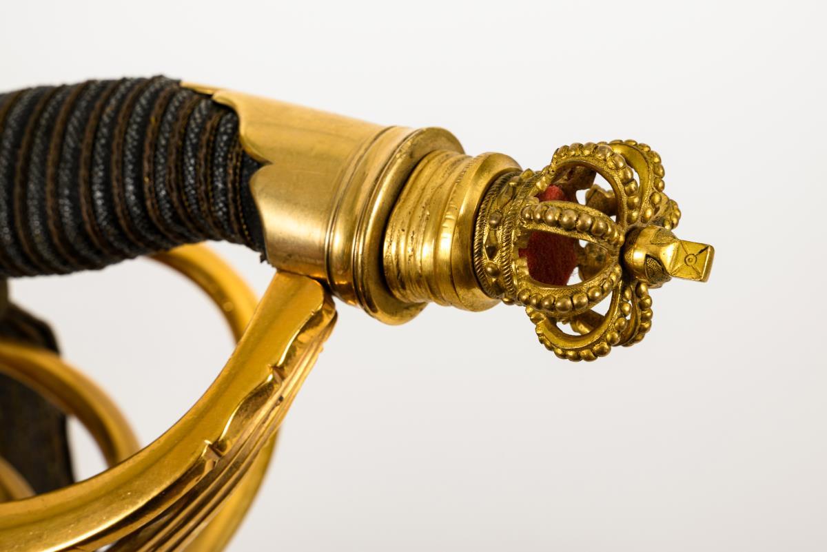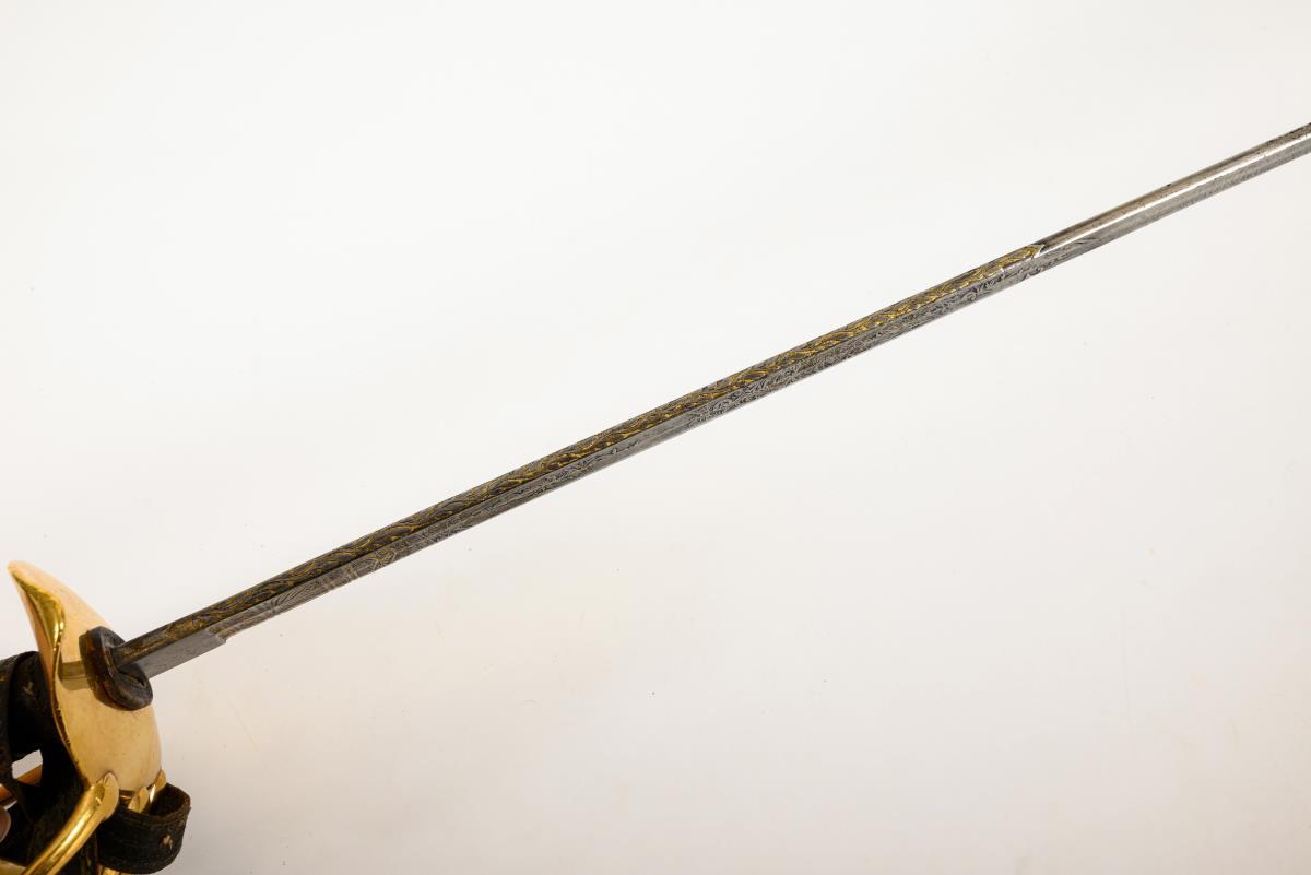 Straight, richly etched blade "Eisenhauer Damascus steel", with remnants of gilding. Oval guard plate and four-bar basket. Crown at the pommel end mounted later. Leather loop for thumb and lanyard. Bright metal scabbard with two suspension rings and traces of repair and suspension.