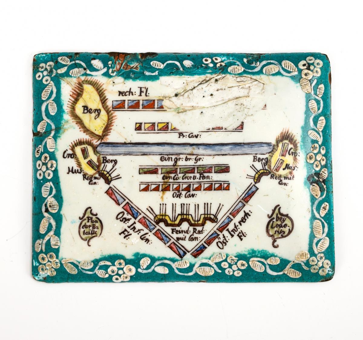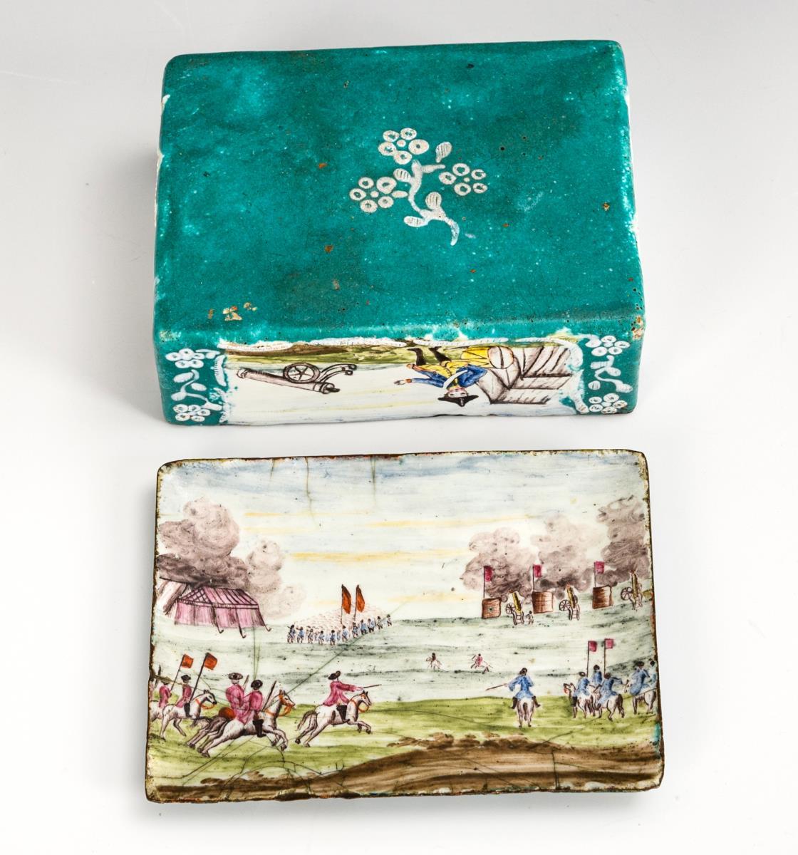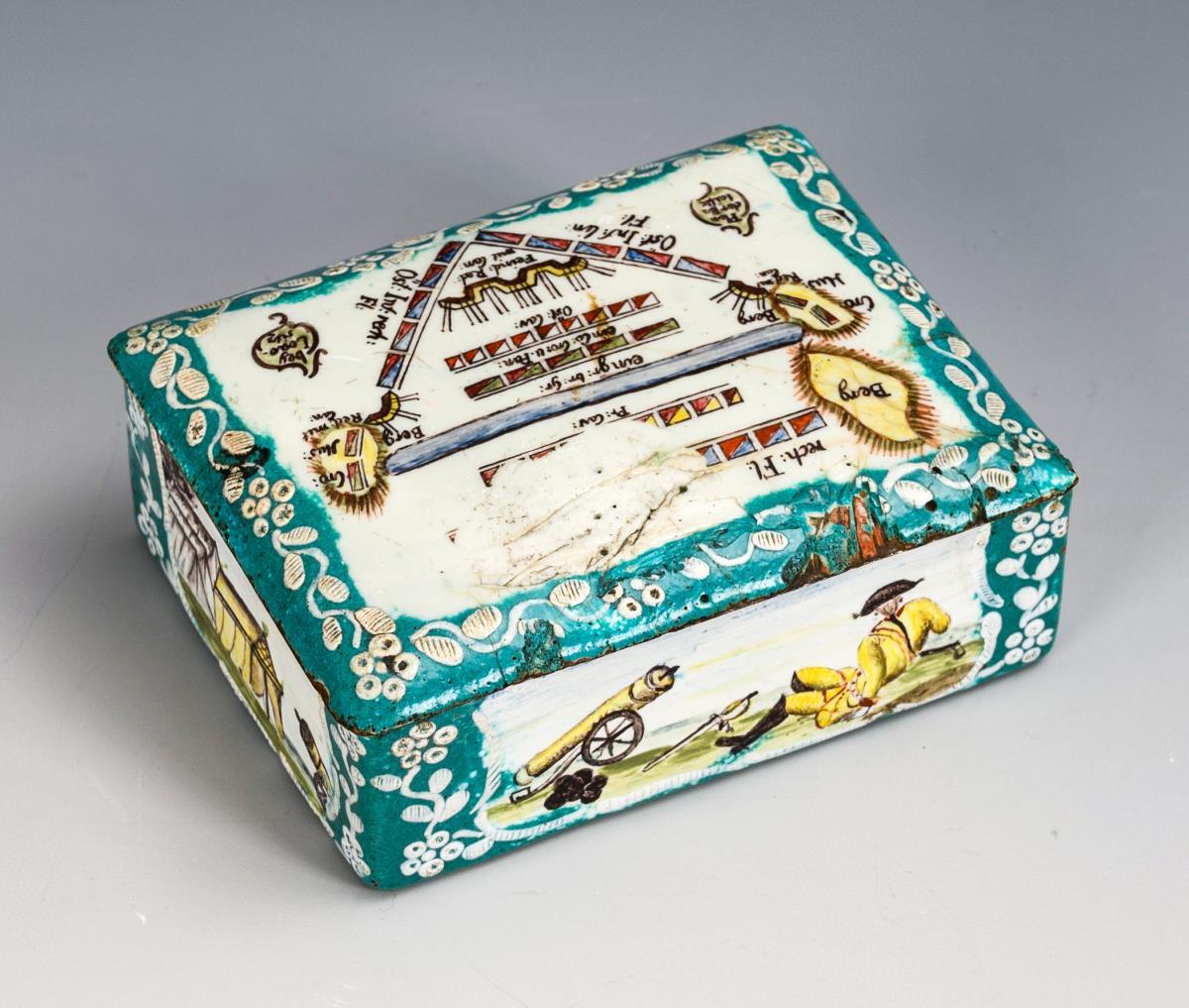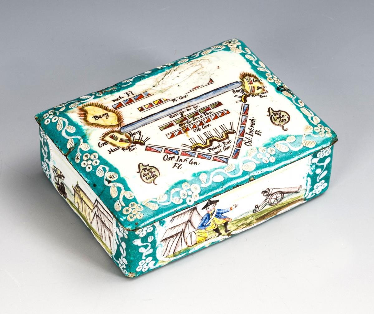 Cuboid box with cambered lid. Inscribed battle formation on the lid, bataille painting with cavalry, infantry, tent camp and cannons on the lid. Bivouac scenes with tents, cannons and soldiers on all sides, a white branch of flowers on the bottom. Box body white inside. Defects and hairline cracks.