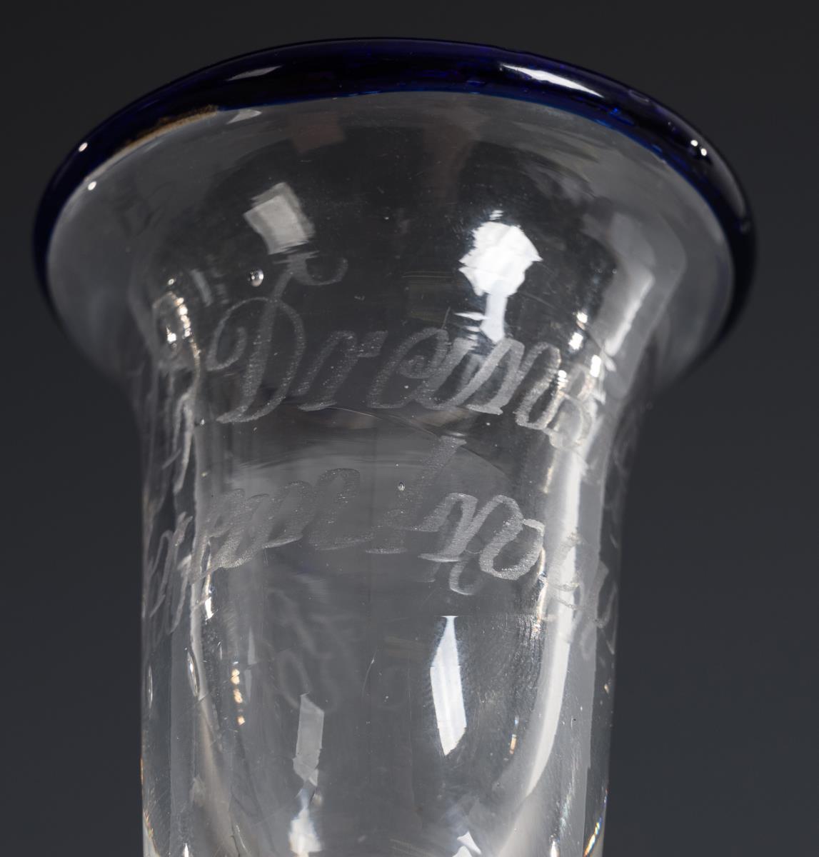 2 shot glasses with funnel domes, 1x solid stem and 1x hollow stem and round foot, 1x marked "G. W. Dranßfeldt Kornbrantwein"; 1x with a tear-off (h 10.5 and 13 cm). / cylinder cup (H 14.5 cm).