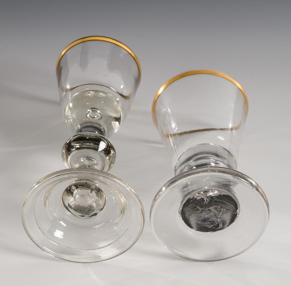 1x shot glass with pierced, drop-shaped air bubble in the solid stem (h 11.5 cm). / 1x goblet with conical bowl, pierced air bubble in the solid bowl base, baluster stem with pierced air bubble and bell foot with turned rim (h 16.5 cm). Both with chipping. 1x gold rim somewhat rubbed.