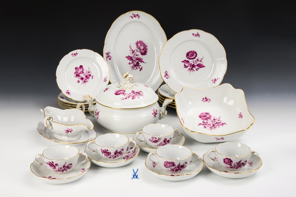 Dinner service with purple painting. Meissen.
