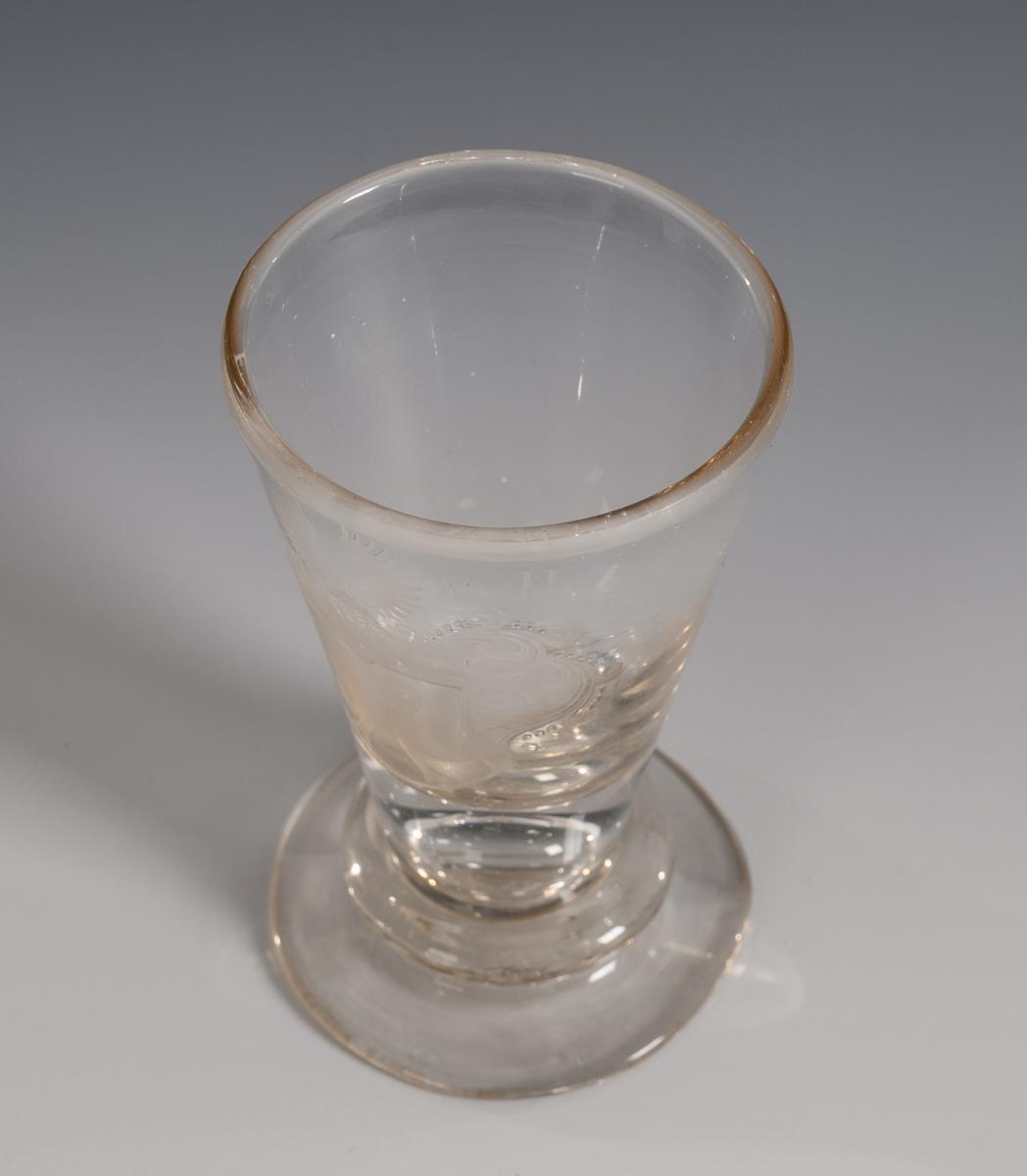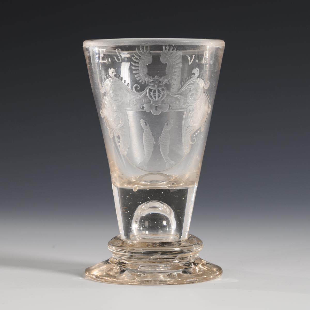 Brandy glass with conical goblet merging into the solid stem with pierced air bubble, round base; chipped. On the front the engraved coat of arms of Saalfeld, above the monogram "E. S. v. H.".