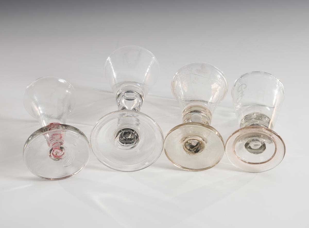 1x goblet glass with drop-shaped air bubble in solid stem and round foot with turned rim (h 15 cm). / 1x thread glass with funnel-shaped bowl and red and white spiral thread fused into the solid stem (H 11.5 cm). / 1x with hollow stem and engraved vine tendril (H 12 cm). / 1x with engraved bubble wreath and hollow shaft, ball frieze and the monogram "JP" (H 10.5 cm).