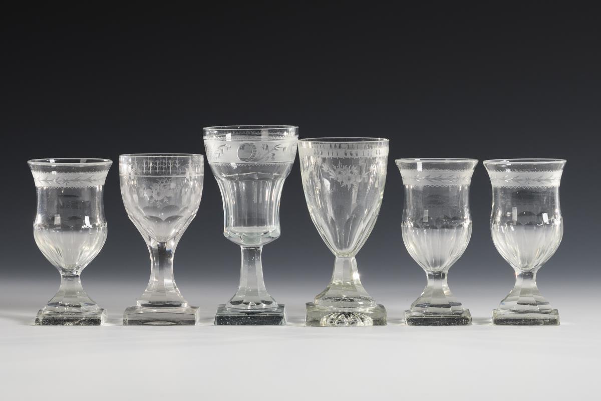 3 identical and 3 different glasses with faceted stem and square foot. All with fine, floral engraving. Feet partly slightly bumped.