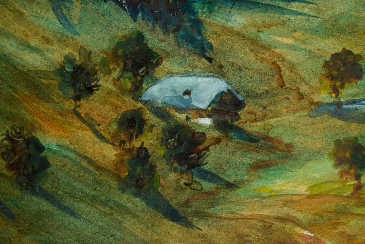 Mountain range with fir trees and small hut by a stream. Minimally yellowed.