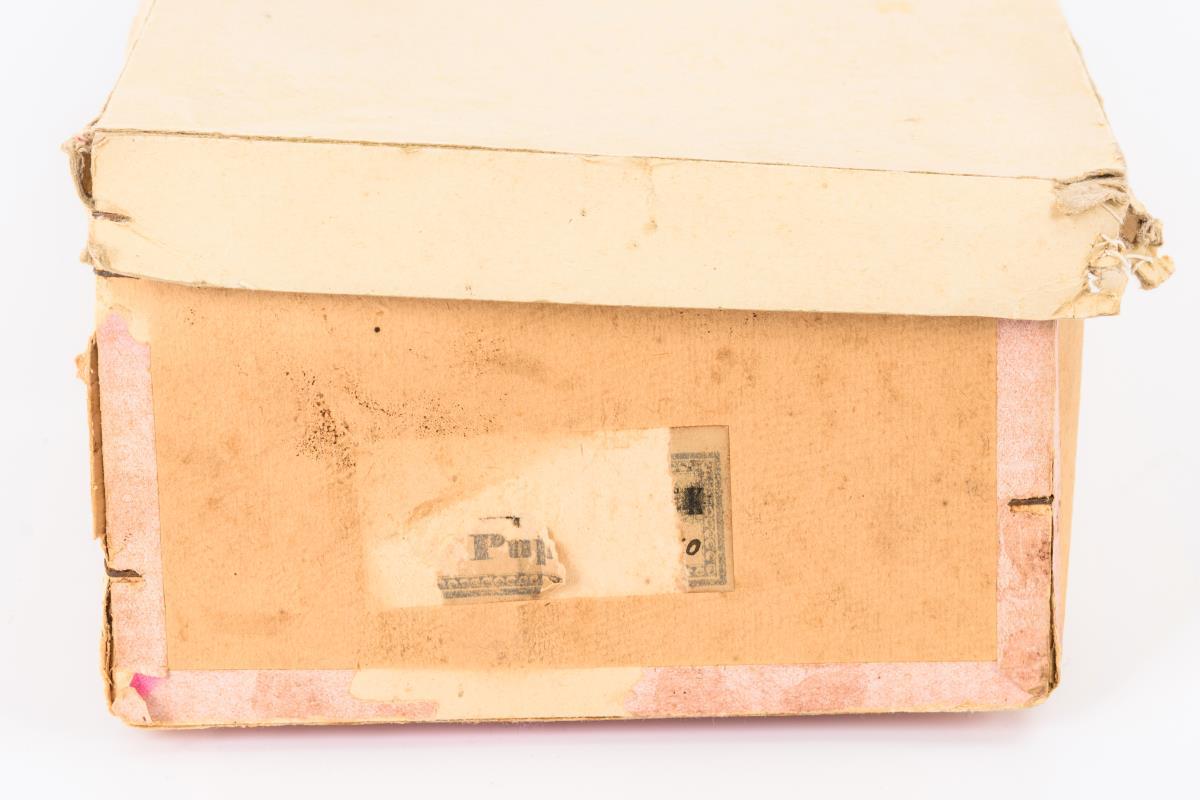 Kopf nicht durchleuchtet, ohne sichtbare Defekte. Wohl weitgehend originaler Zustand, Altersspuren. Karton mit Defekten.