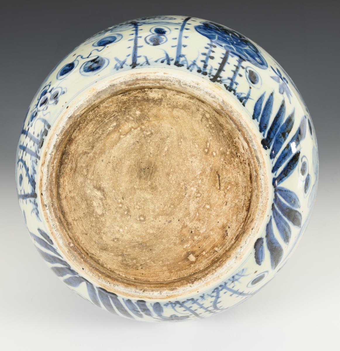 Circulating underwater scene with various fish, tadpoles(?) and lotus plants in nuanced blue painting. One area on the shoulder with glaze flaws and crystallized efflorescence.