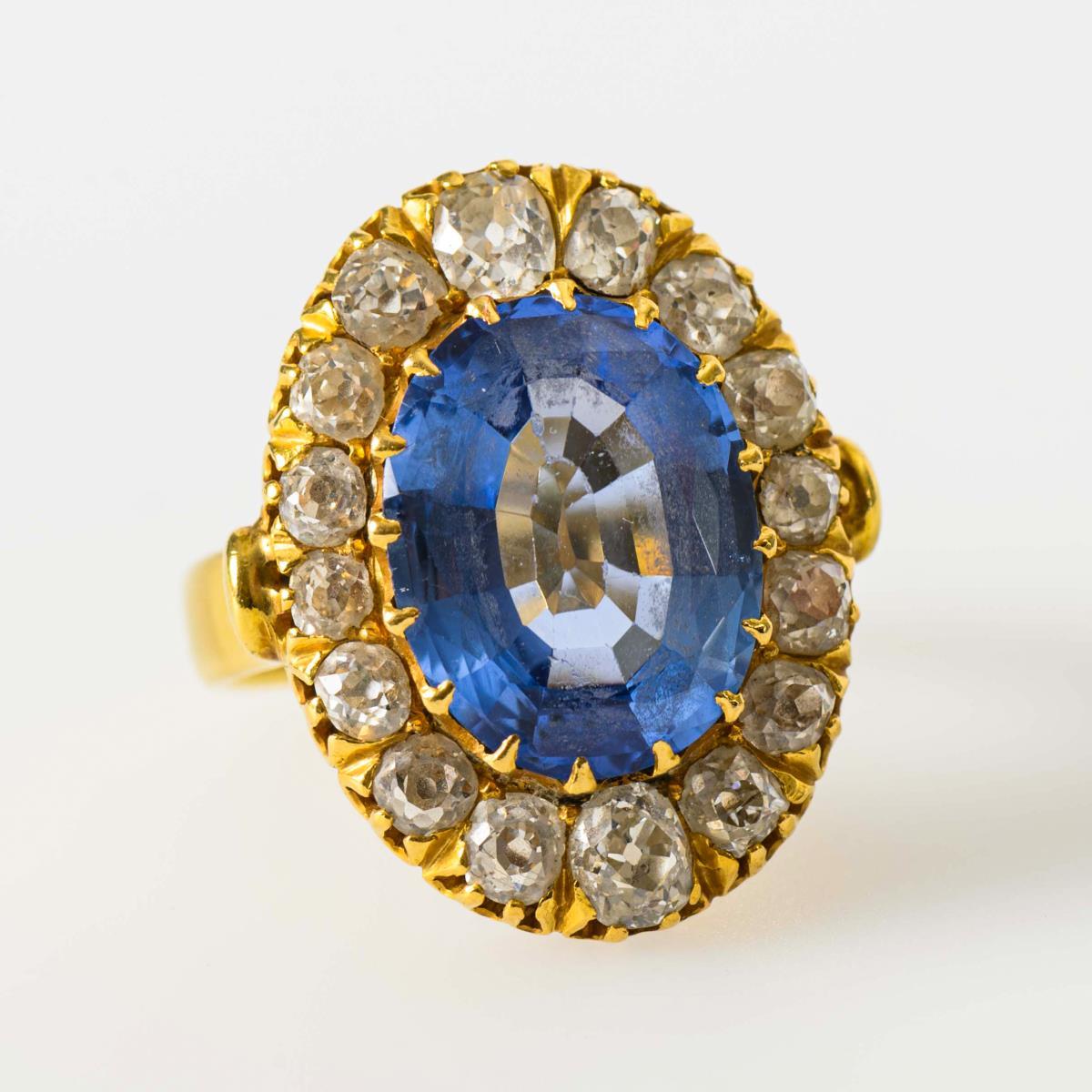 Large entourage ring with sapphire synthesis? and old-cut diamonds.