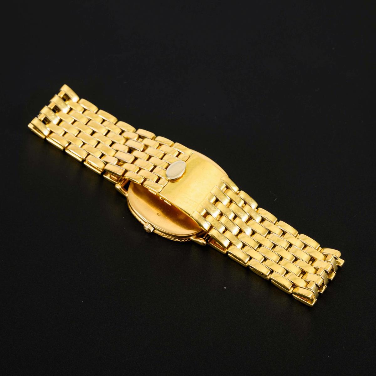 Stamped 750 yellow gold. Case 3 x 3 cm. Bracelet B 1.8 cm. Ø 7 cm, shortening possible. 93,1 g.