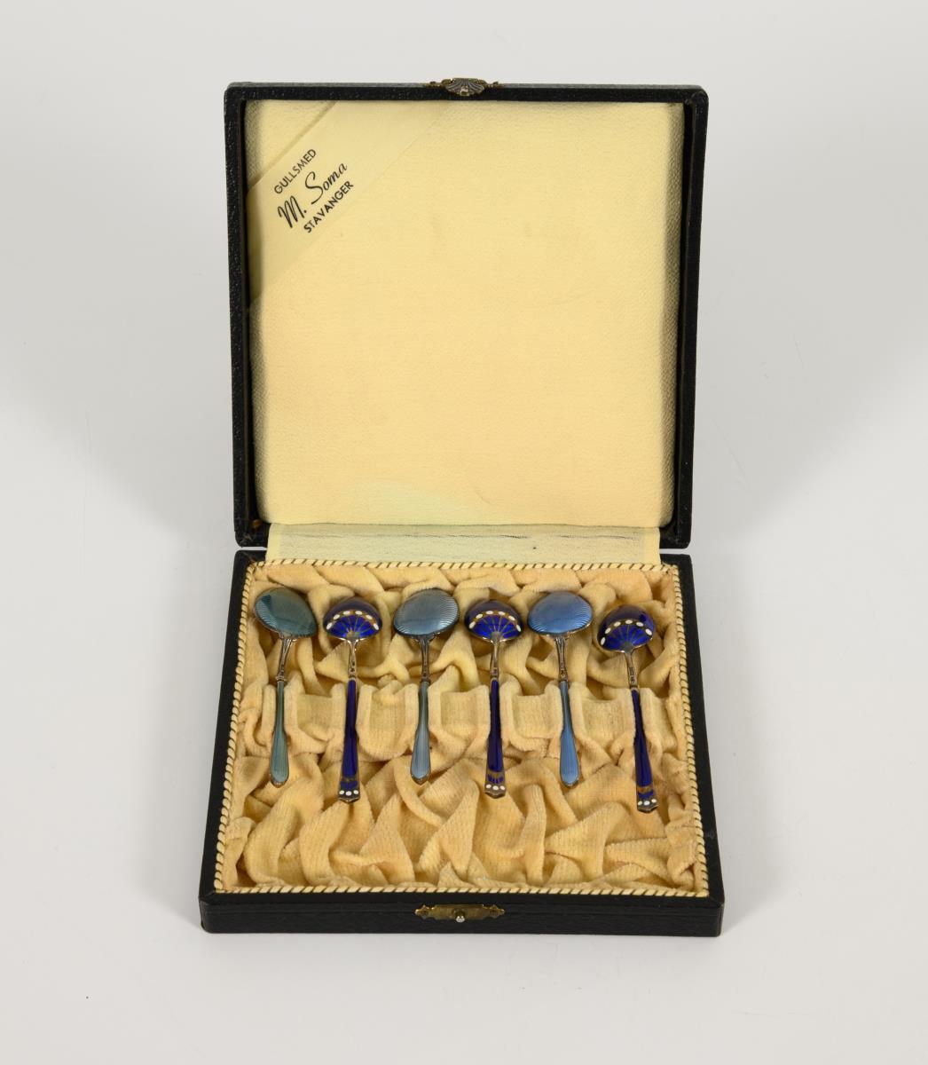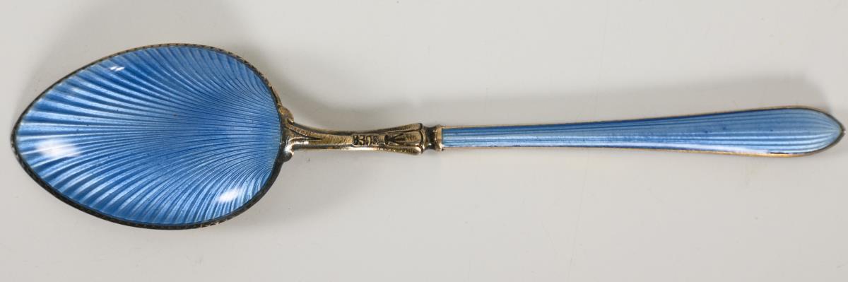 Spoon enameled in shades of blue. In a black casket by the goldsmith M. Soma, Stavanger. 1 spoon with enamel defect.