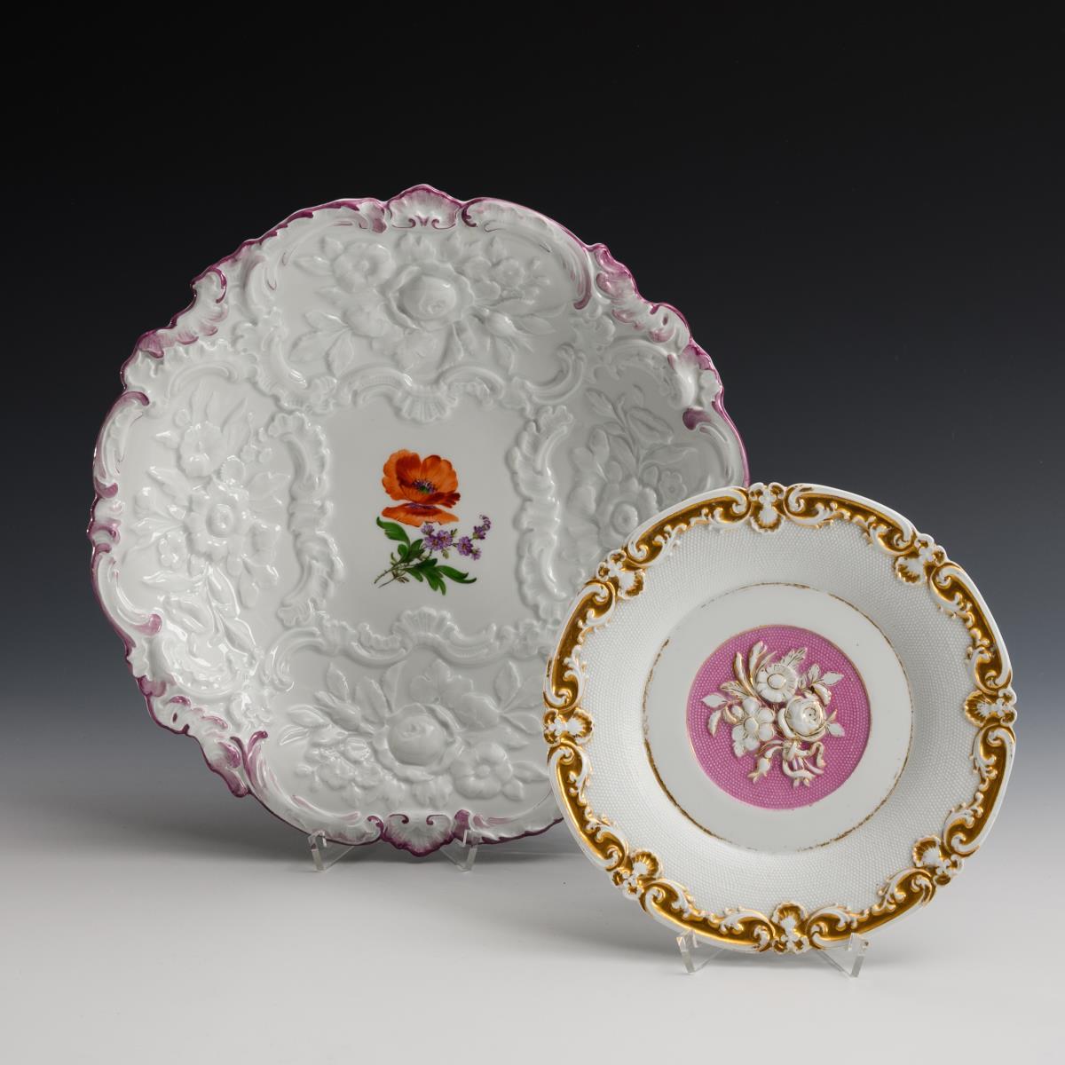 1x 1816-1824: Plate with rocaille and floral relief and pearl ground (Ø 20.5 cm). / 1x 1934-1945: Bowl with floral relief, purple painted rim and depiction of a poppy flower in a mirror (Ø 31 cm). 1x minimal gold wear.