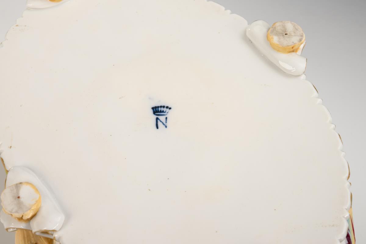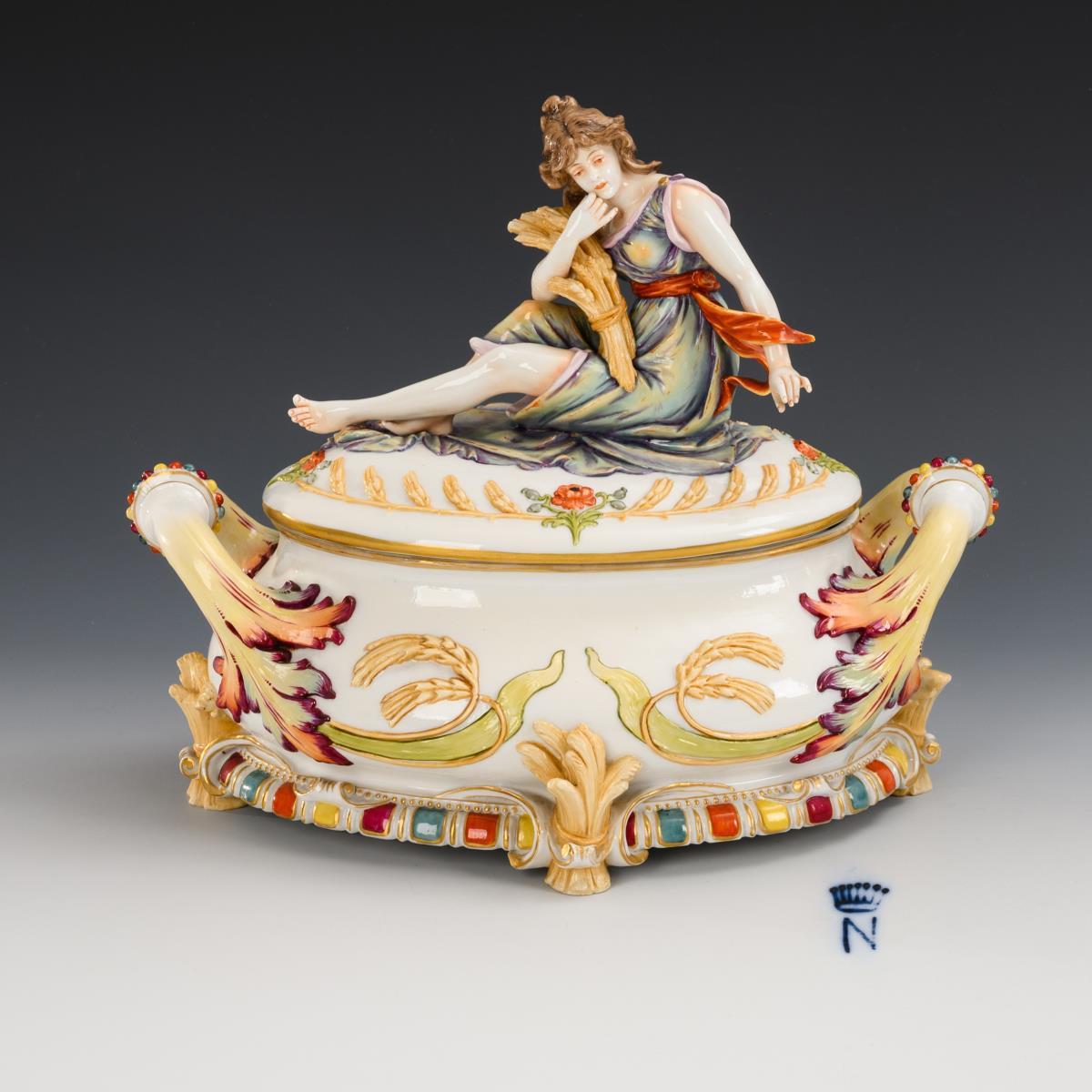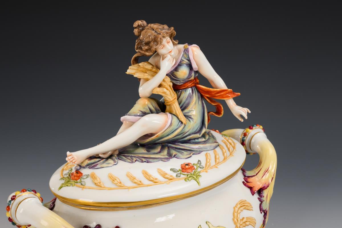 Oval tureen with two handles with sheaves and ears of corn relief, on the lid a female figure as an allegory of summer sitting with a bundle of sheaves. Partial minimal gold wear.