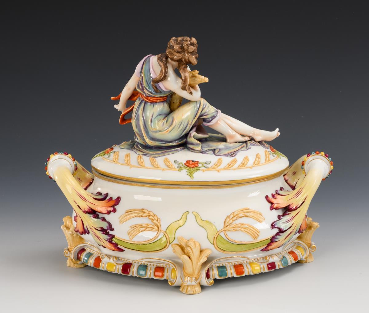 Oval tureen with two handles with sheaves and ears of corn relief, on the lid a female figure as an allegory of summer sitting with a bundle of sheaves. Partial minimal gold wear.