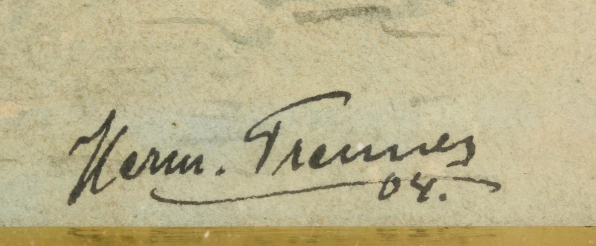 Stadtansicht mit Staffage. Tusche/Aquarell, rechts unten signiert/datiert: (19)04, links unten teils undeutlicher Zusatz "Frankfurt/M Kl. Fischerg." Staffagefiguren auf der Straße am Eingang zur Gasse neben dem Schiffsutensilien-Geschäft. (Bildausschnitt) 20 x 15 cm, verglastes Passepartout mit Lackrahmen 38 x 33 cm. .