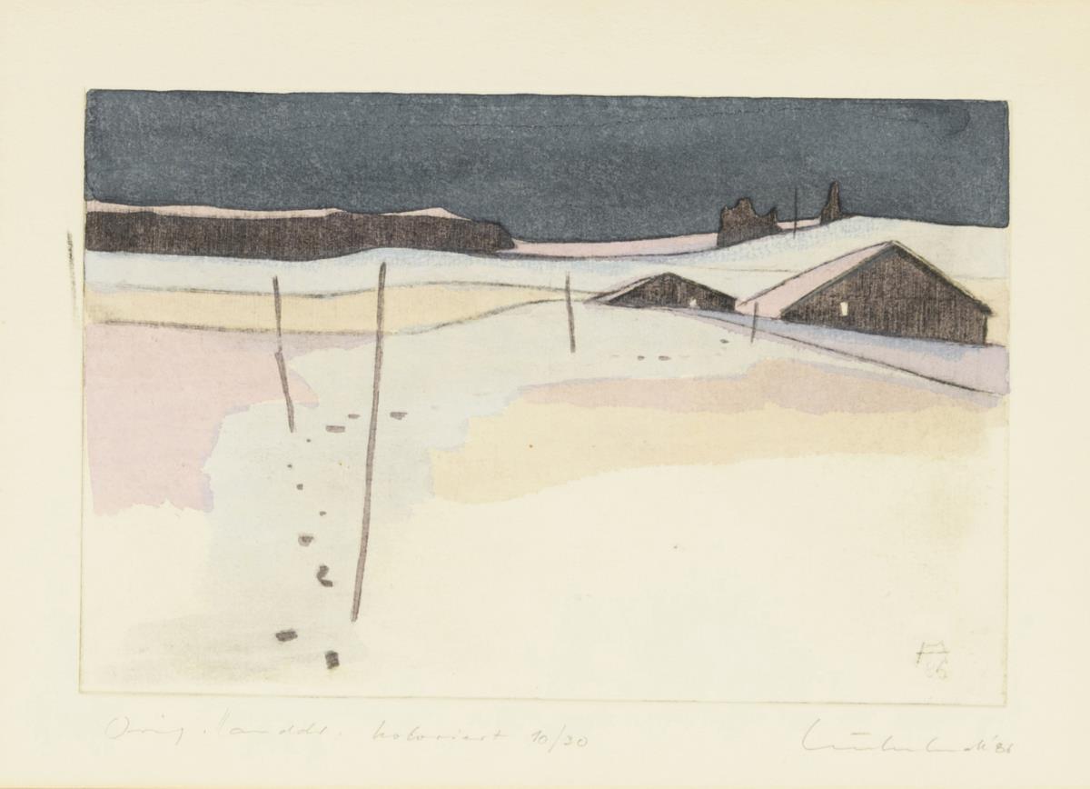 Winter landscape: watercolor etching, original hand print, copy: 10/30, [19]86, printing plate: 16 x 24.5 cm, framed & behind glass: 53 x 63 cm | Woman with flowers: hand-colored original woodcut, copy: 62/100, [20]03, printing block: 27.5 x 19 cm, framed & behind glass: 53.5 x 43 cm, signed certificate on verso.