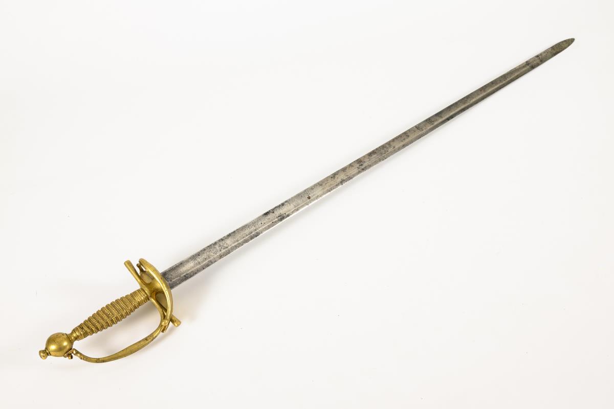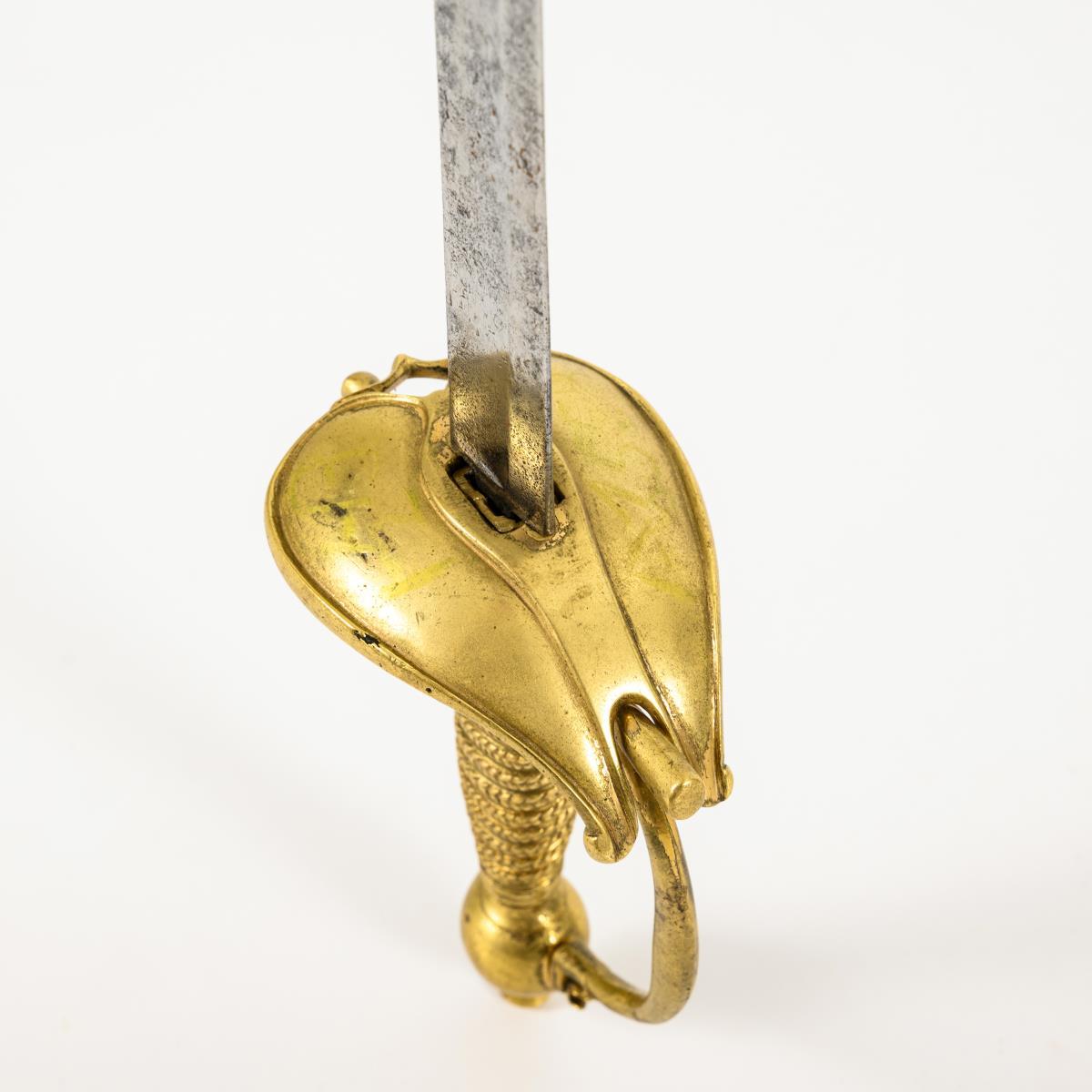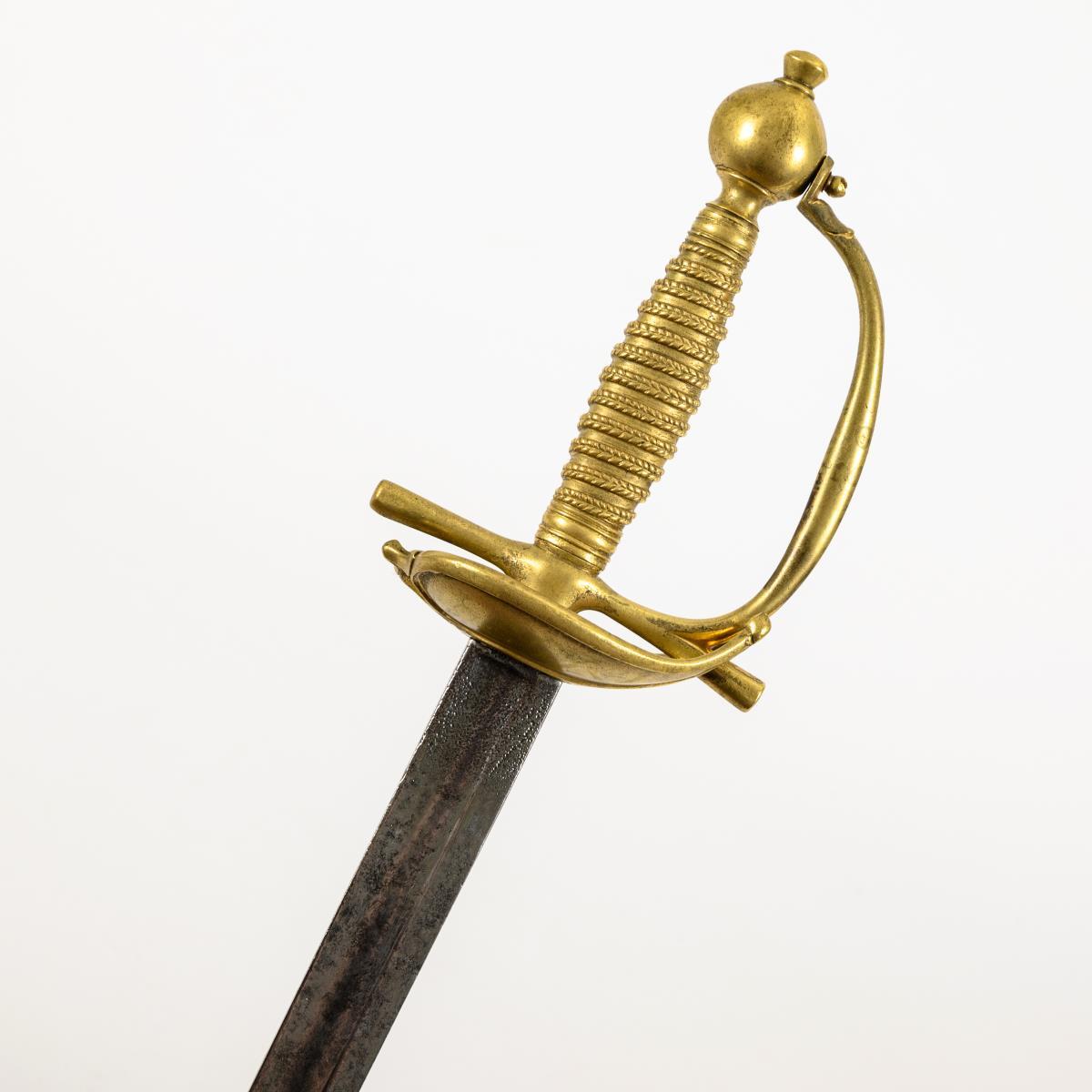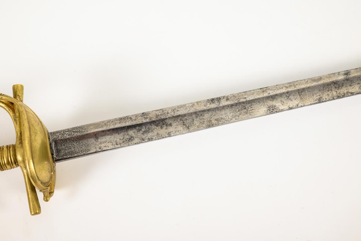 In the style of swords for cuirassier officers. Straight, single-edged blade with a broad fuller. Remnants of pattern etching with profile head and coat of arms depiction. Brass hilt with a heart-shaped, split guard plate, straight quillons and ball pommel. Optical wire winding, but here cast with the grip. Corrosion pits.