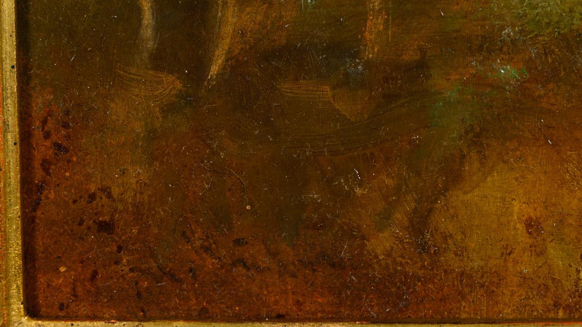 Oil/hard fiber. Signed lower left, inscribed verso.
