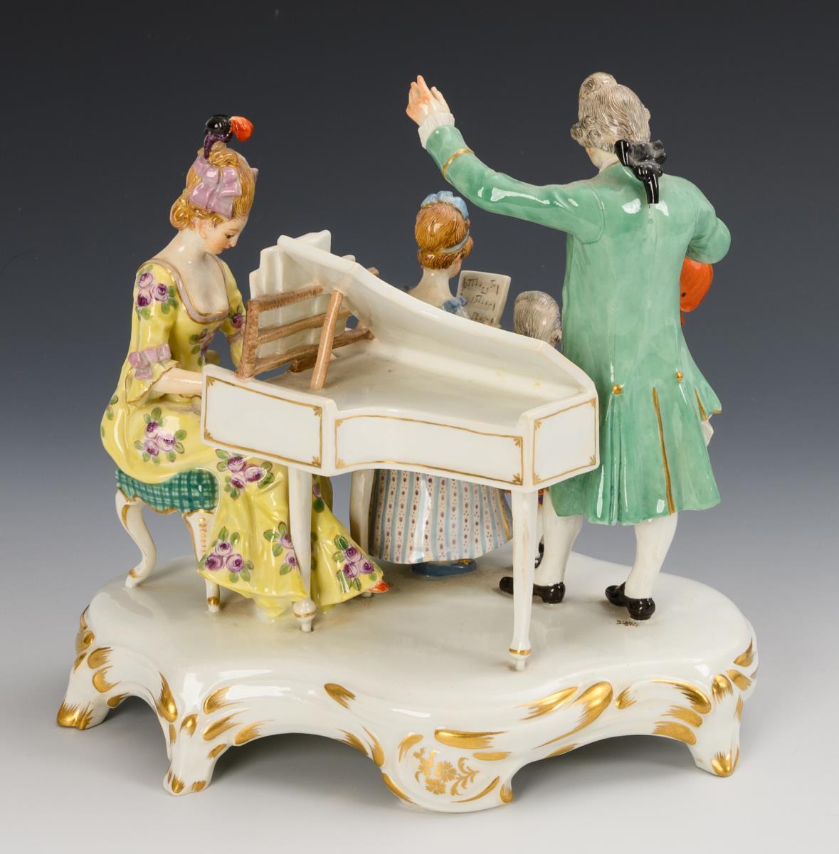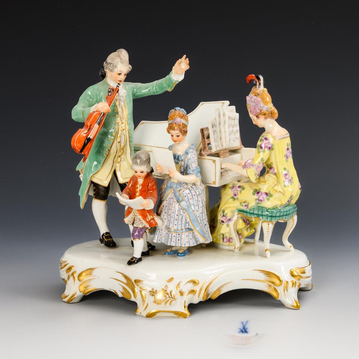 Lady sitting at the spinet, two singing children with sheet music and the conducting father with violin. The man's plait bumped.
