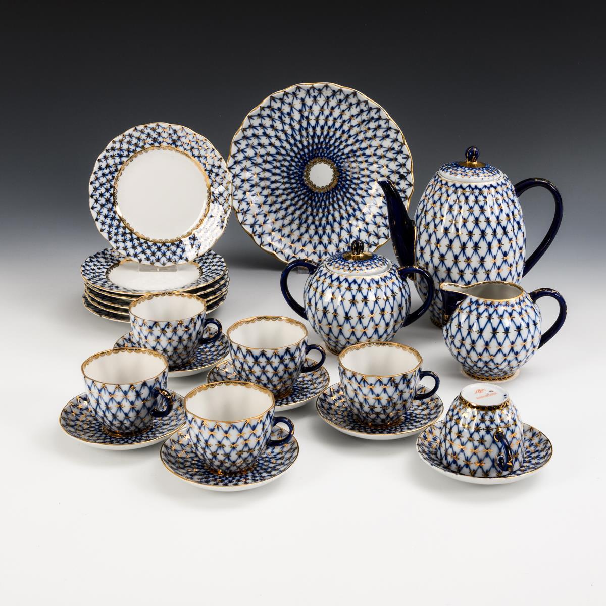 22 pieces. Cobalt blue net pattern and gold decoration. Coffee pot (H 19 cm), milk jug, sugar bowl, 6 coffee cups, 6 saucers, 6 cake plates and 1 bowl (Ø 21.5 cm).