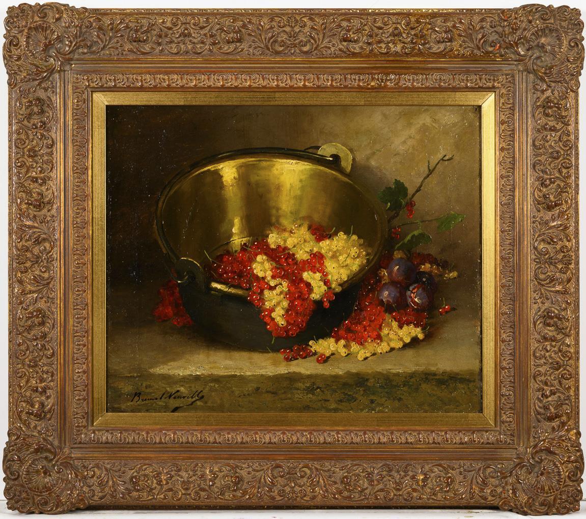 Currants and plums in a kettle in bright light. Canvas mounted.