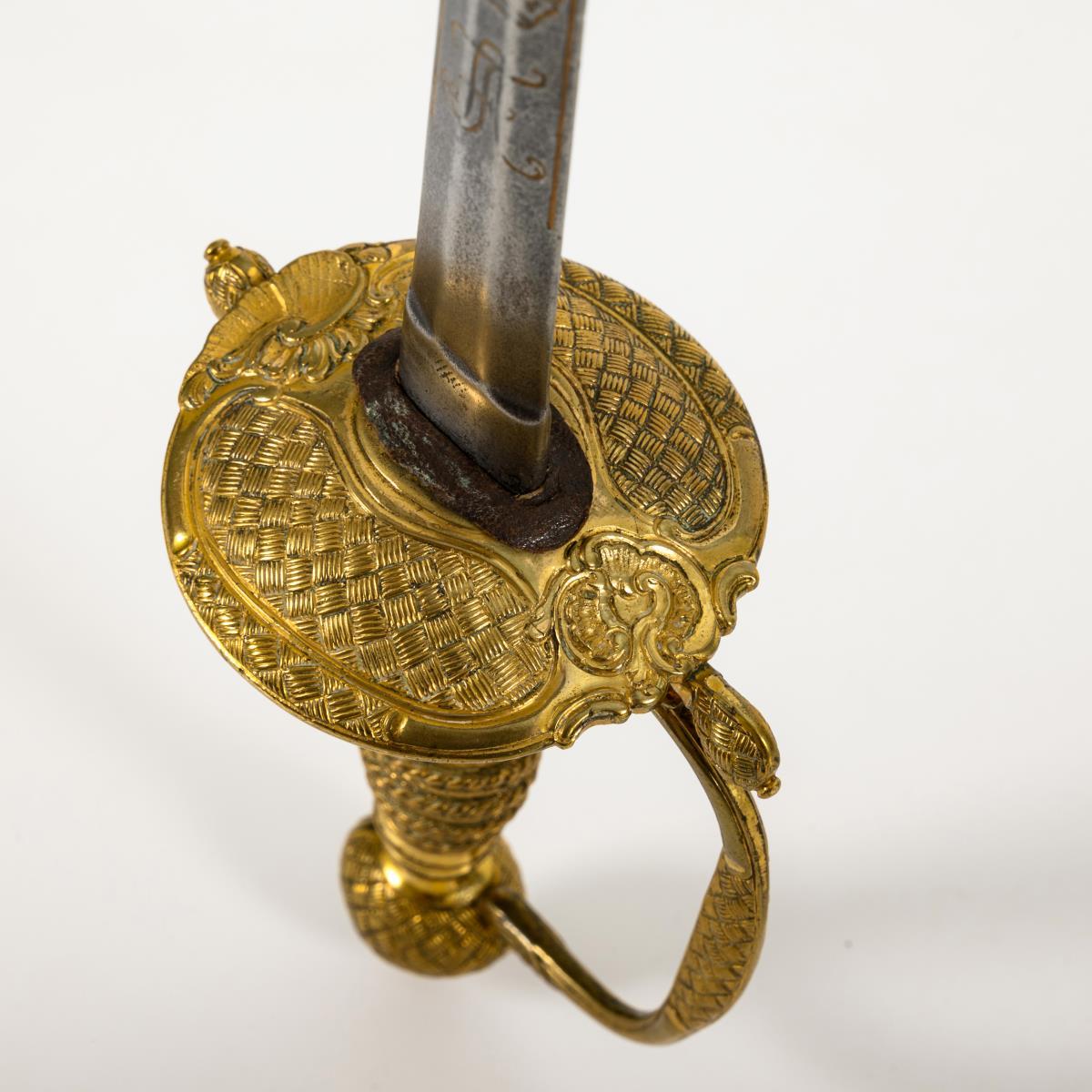 Straight double-edged blade with hexagonal cross-section. Engraved and gilded monogram "FA" with an elector's hat on both sides. Plate-like guard plate. This, as well as the ball pommel, quillons and knuckle-bow with a braided pattern in relief. Cast grip with imitation winding.