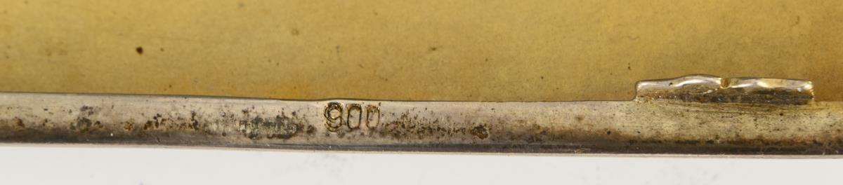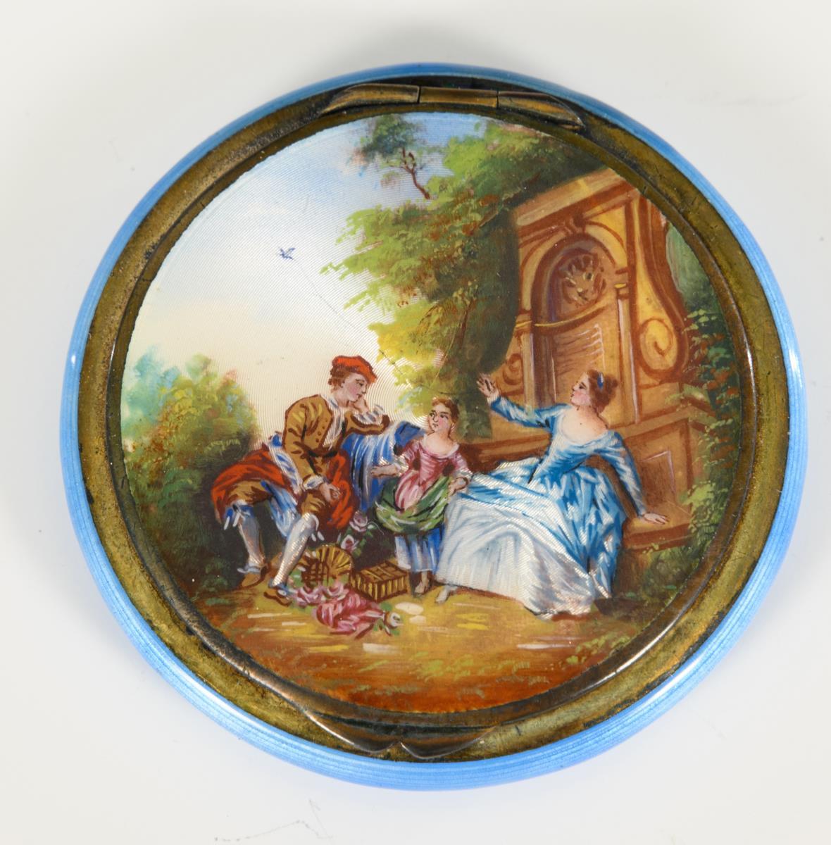 Silver cigarette case (stamped 900) with white enameled spandrels. Signs of wear. 8.5 x 7.5 cm, 125 g. / Small round powder box with figuratively painted lid and light blue translucent enamel. With powder residue and fine crack in the lid. In a black case. Ø 5 cm.