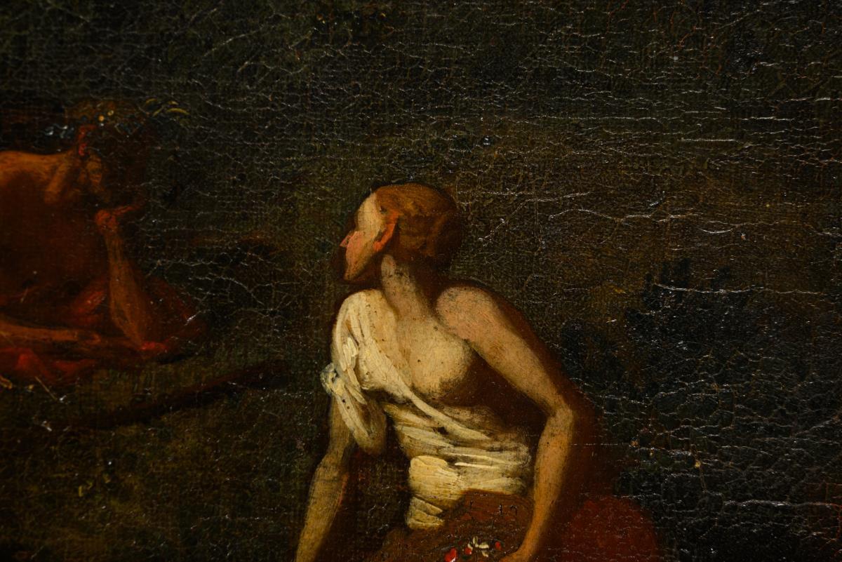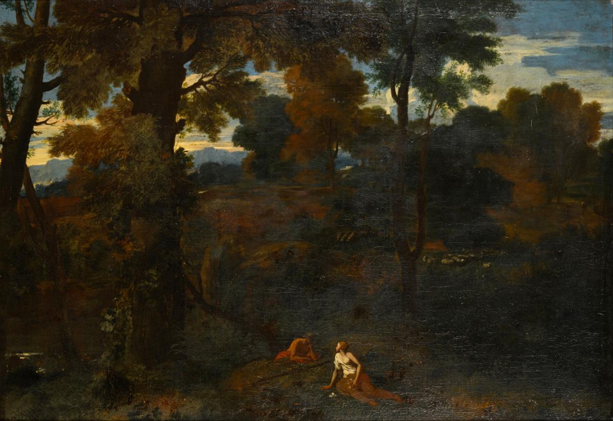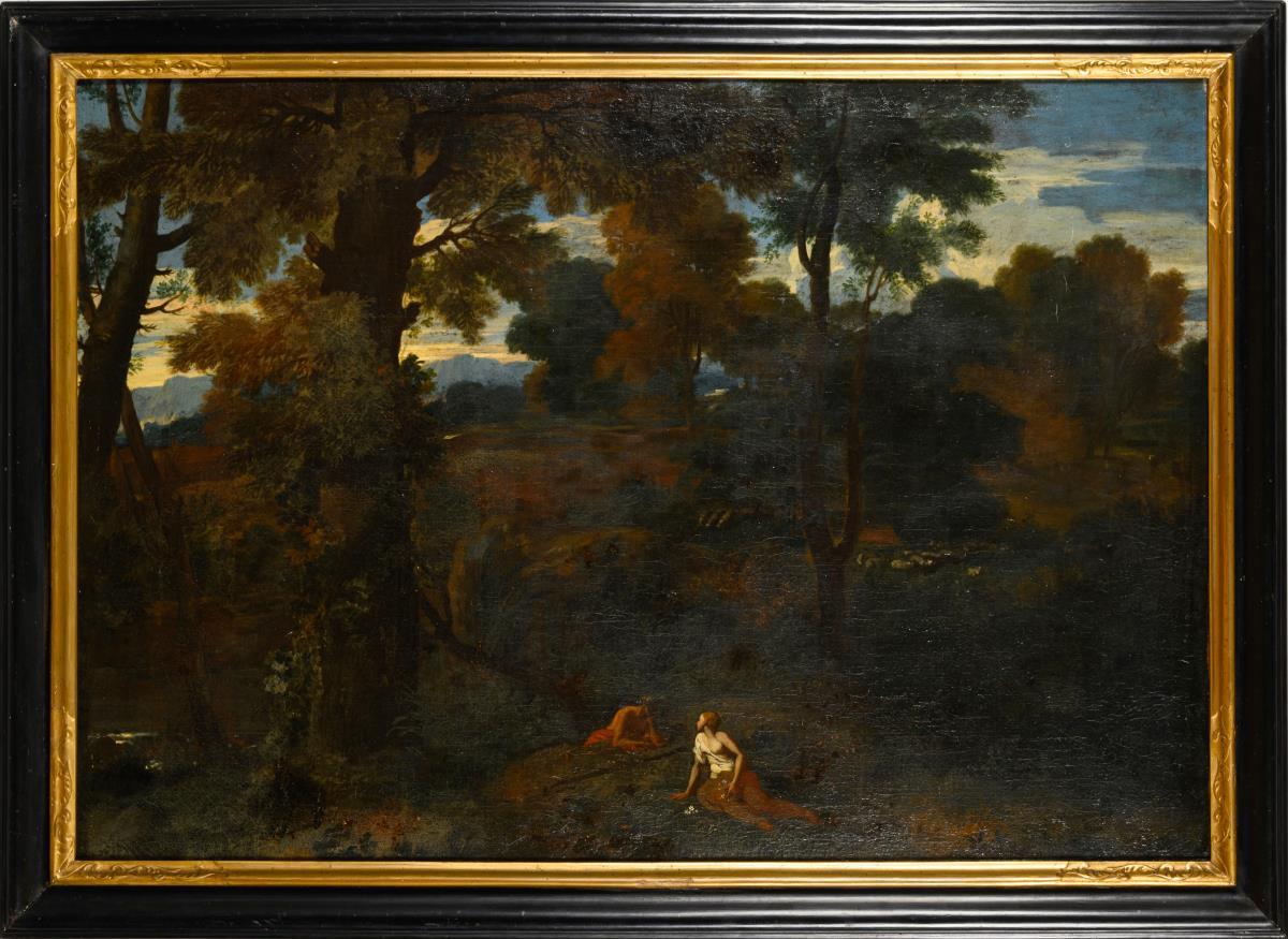 Classicist-baroque landscape in the manner of Nicolas Poussin of a pair of shepherds in a meadow near a flock of sheep in conversation in a wide forest and meadow landscape under a cloudy sky. Doubled canvas.