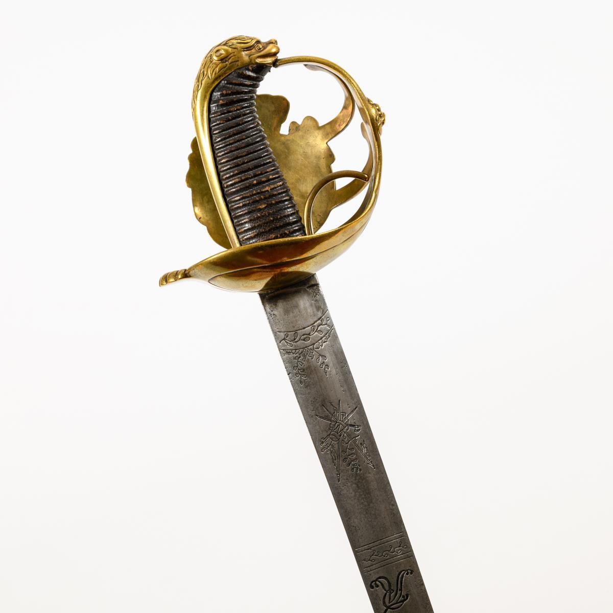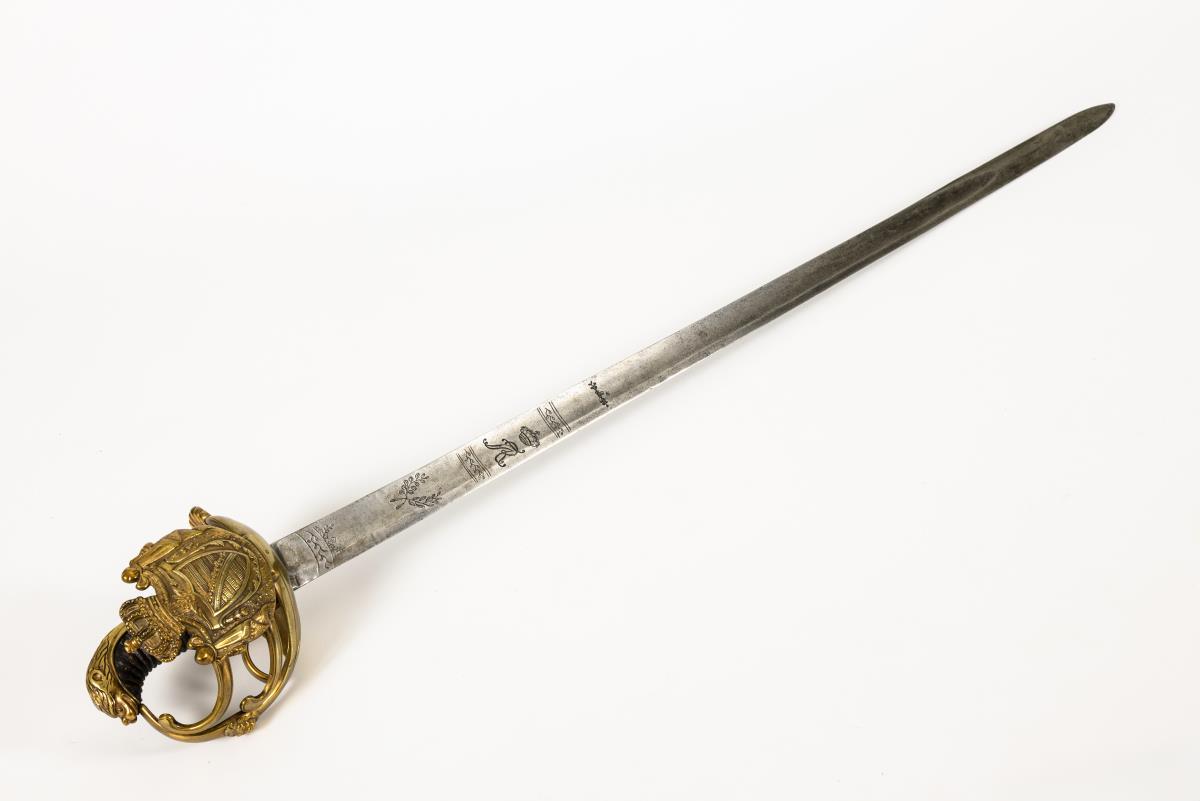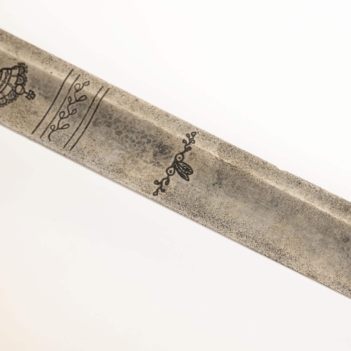 Straight, single-edged blade with a broad fuller and a point in the midline. Both sides of the blade similarly engraved, with the crowned monogram "FAR". Brass hilt with a large Saxon coat of arms in relief. Heart-shaped, domed guard plate with a palmette-shaped end. Thumb ring, hilt with small lion's head. Lion's head grip with leather cover, 24-fold ribbing, wire winding missing.