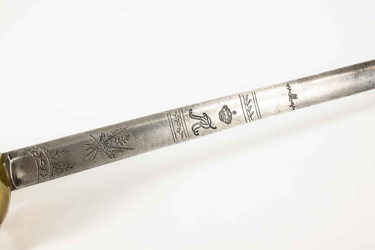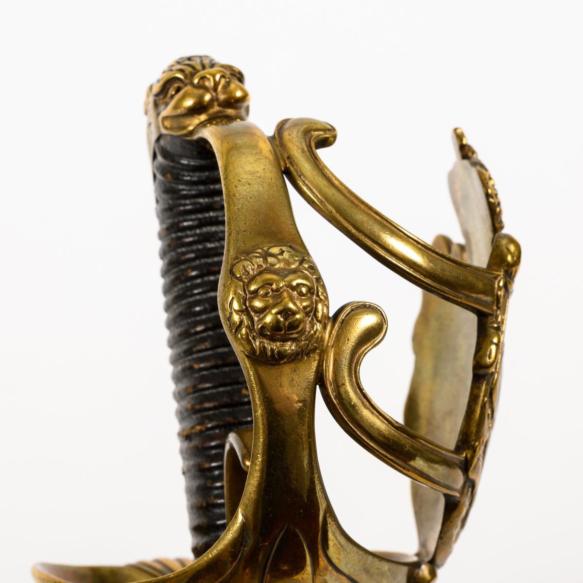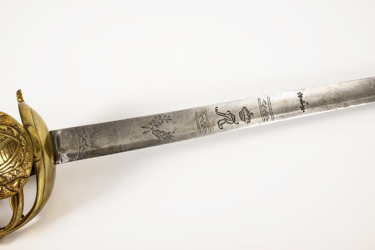 Straight, single-edged blade with a broad fuller and a point in the midline. Both sides of the blade similarly engraved, with the crowned monogram "FAR". Brass hilt with a large Saxon coat of arms in relief. Heart-shaped, domed guard plate with a palmette-shaped end. Thumb ring, hilt with small lion's head. Lion's head grip with leather cover, 24-fold ribbing, wire winding missing.