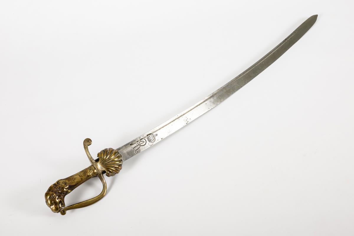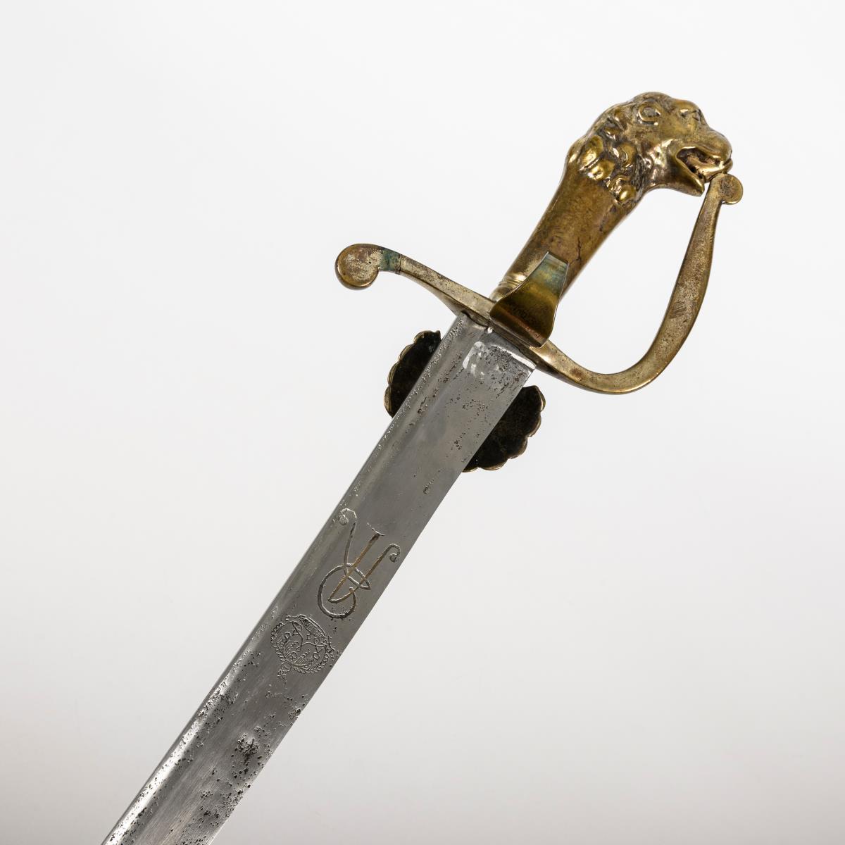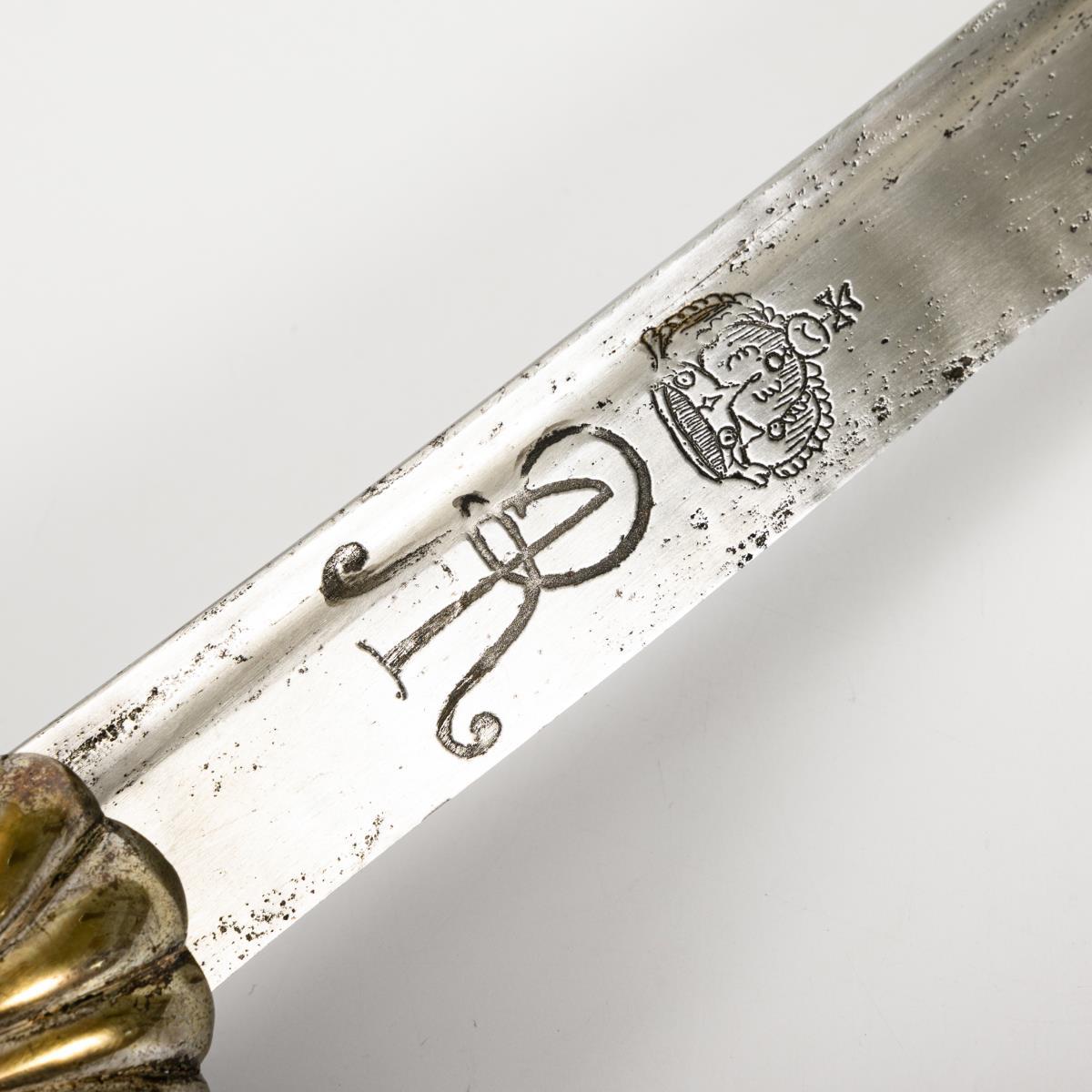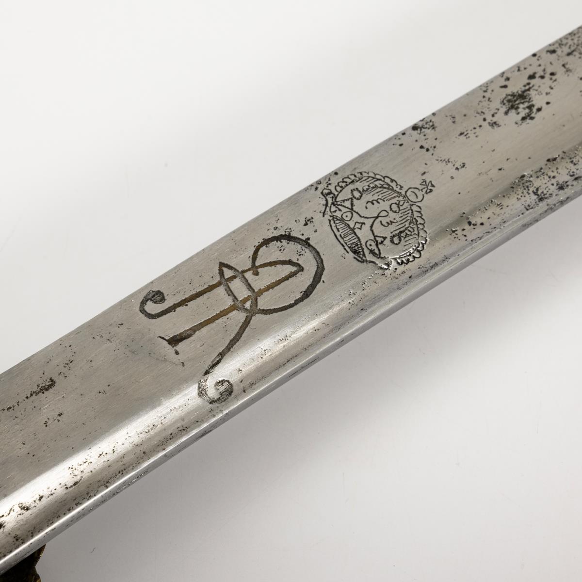 Curved, single-edged blade with a point in the midline and a narrow fuller on the back. On both sides the monogram "AR" with an electoral hat. Brass hilt, heavily plastered, with a palmette-shaped quillons and guard plate, curved towards the blade. Upper end of the hilt attached to the guard mouth. Seam of the grip partially open, newly riveted.