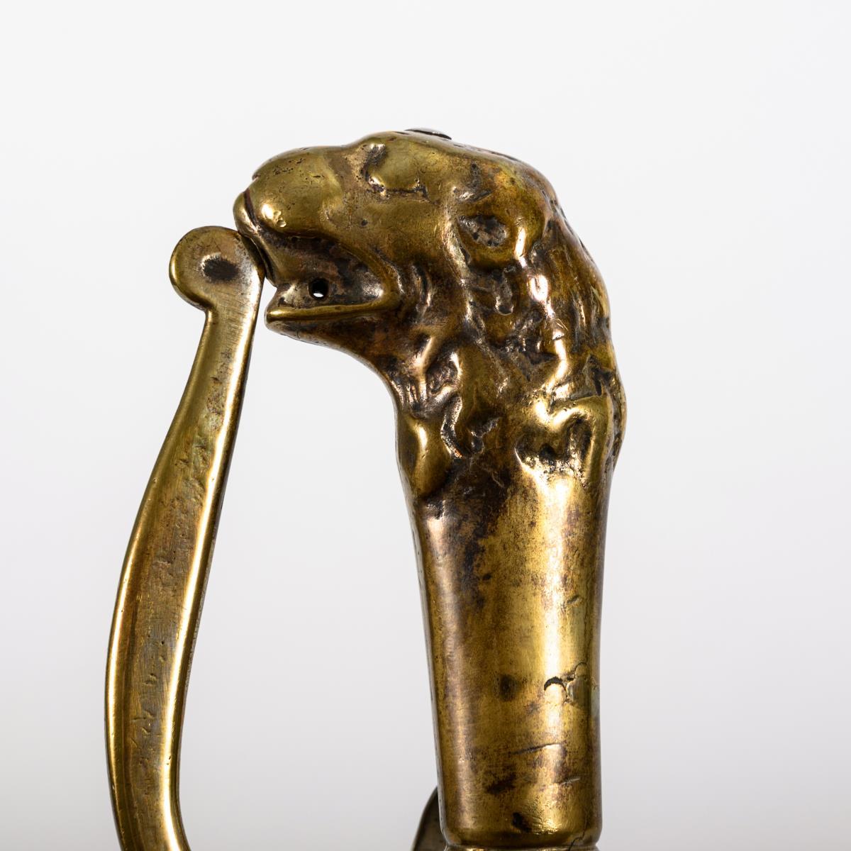 Curved, single-edged blade with a point in the midline and a narrow fuller on the back. On both sides the monogram "AR" with an electoral hat. Brass hilt, heavily plastered, with a palmette-shaped quillons and guard plate, curved towards the blade. Upper end of the hilt attached to the guard mouth. Seam of the grip partially open, newly riveted.