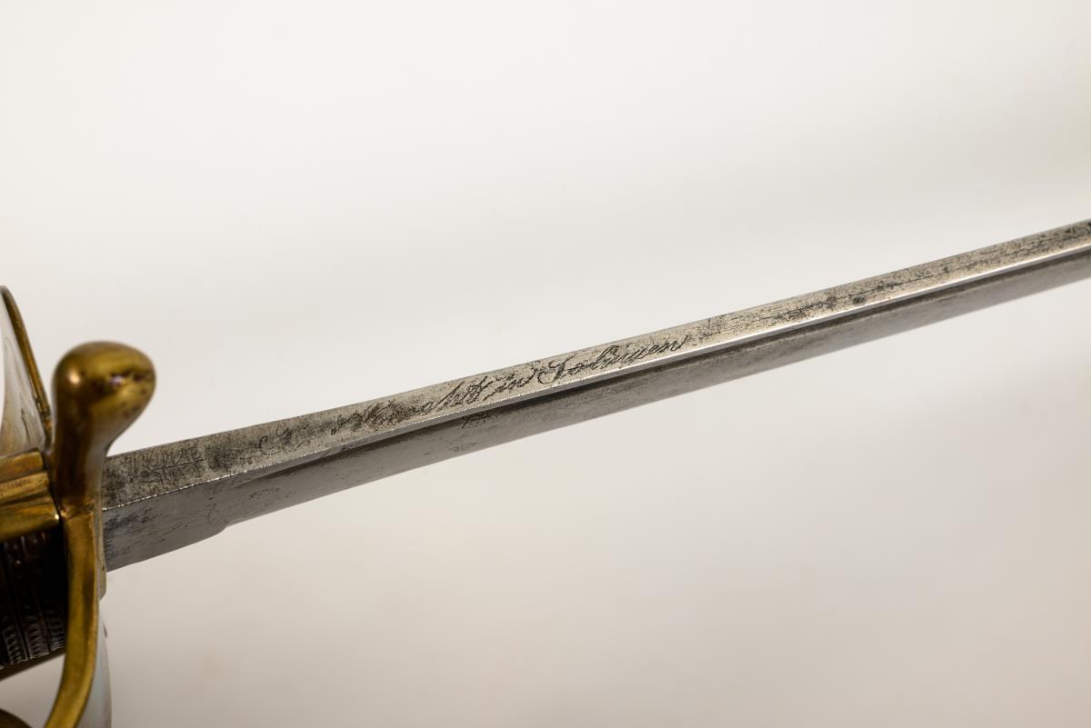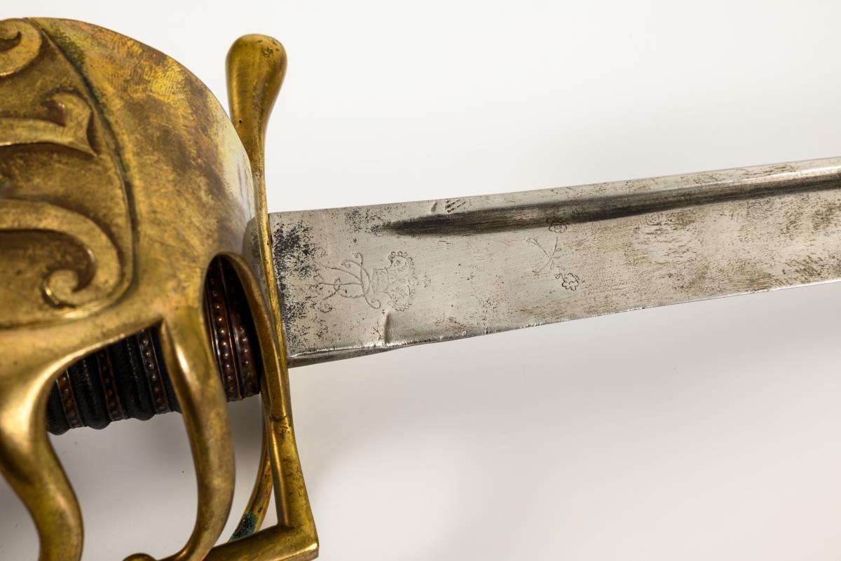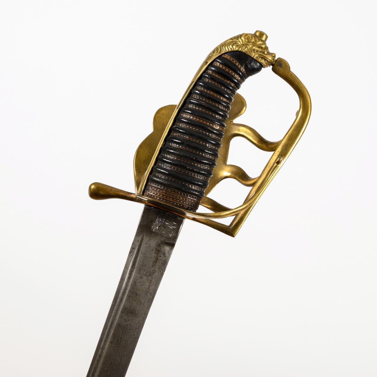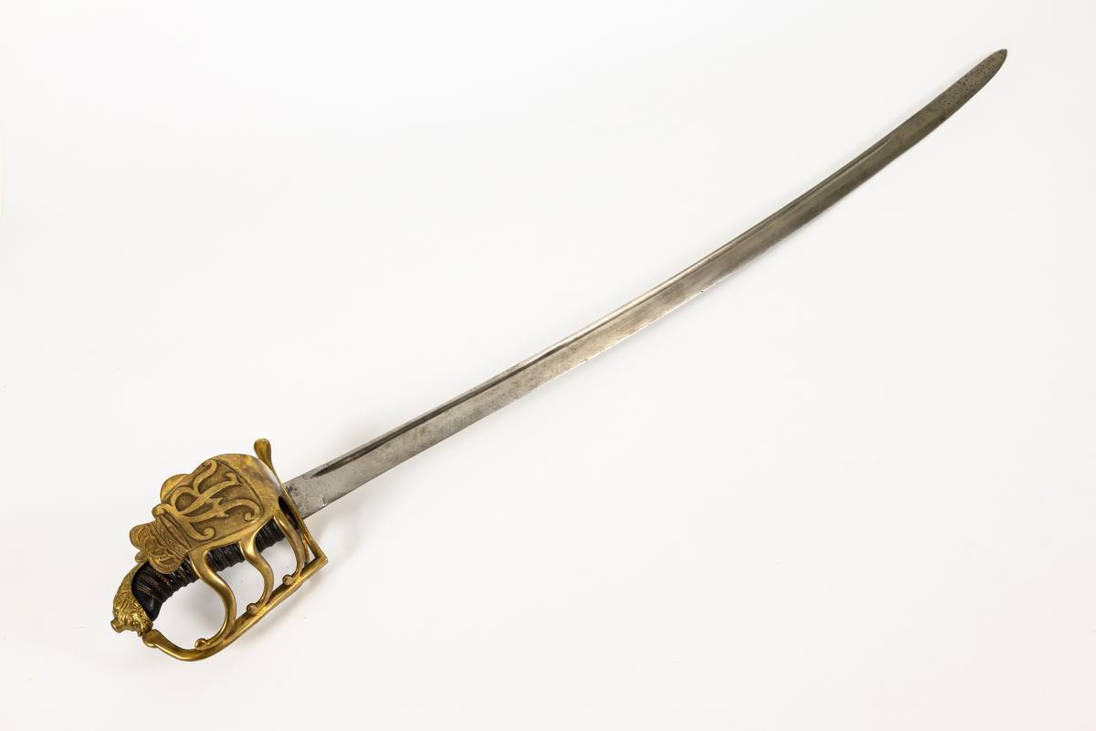 Slightly curved, single-edged blade with a point in the middle and a narrow fuller on the back. Crowned monogram "FAR" on the ricasso, other side probably crowned coat of arms (plastered) above the ricasso. Lion's head grip covered with leather and wrapped with a beaded copper band. Four-bar basket with flat, crowned monogram "FAR". Blade with minor nicks.