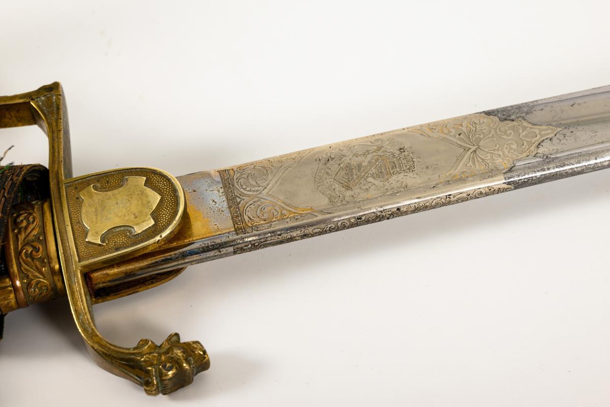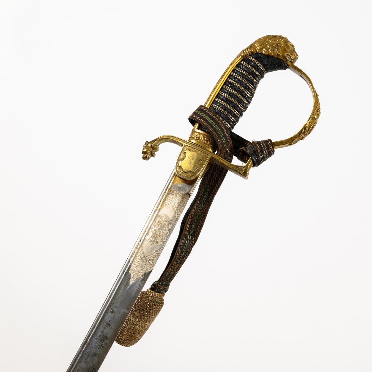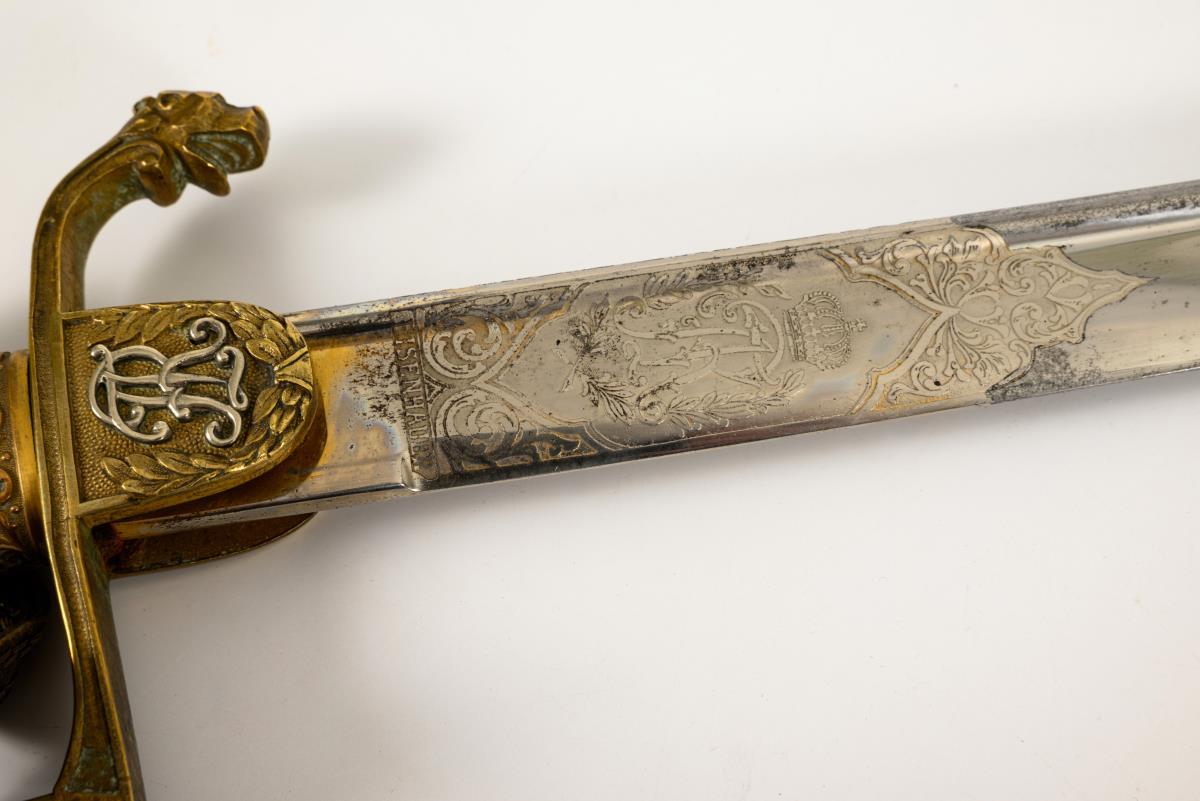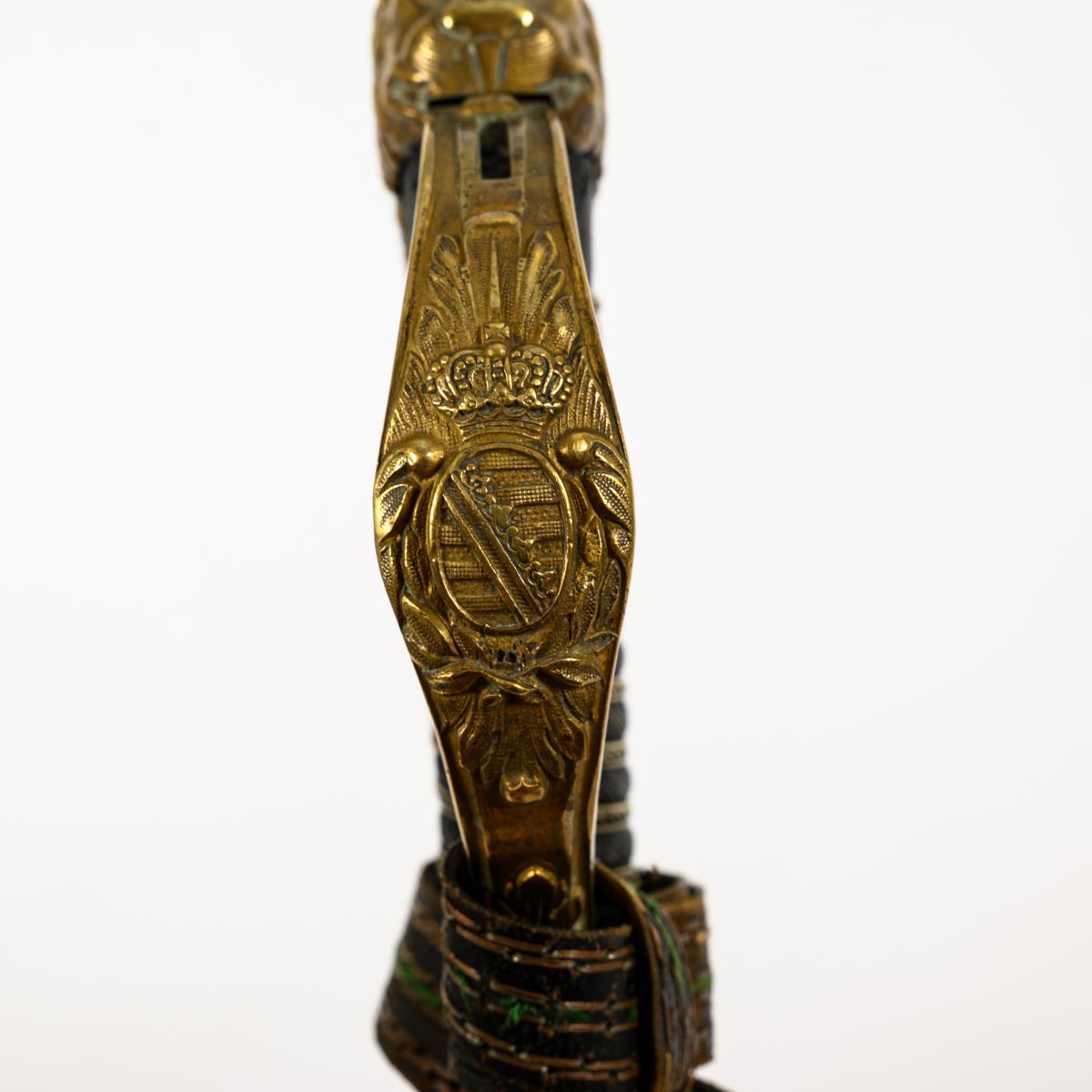 Curved, single-edged blade with fuller and guard. Etched monogram "FAR" with crown and the Saxon coat of arms, the back also decorated. Brass hilt with lion's head and paws. The Saxon coat of arms encircled on the hilt. Crossguard end in the shape of an animal's head. Lobe with silver monogram "FAR" and laurel wreath. Black metal scabbard with a movable ring and square eyelet.