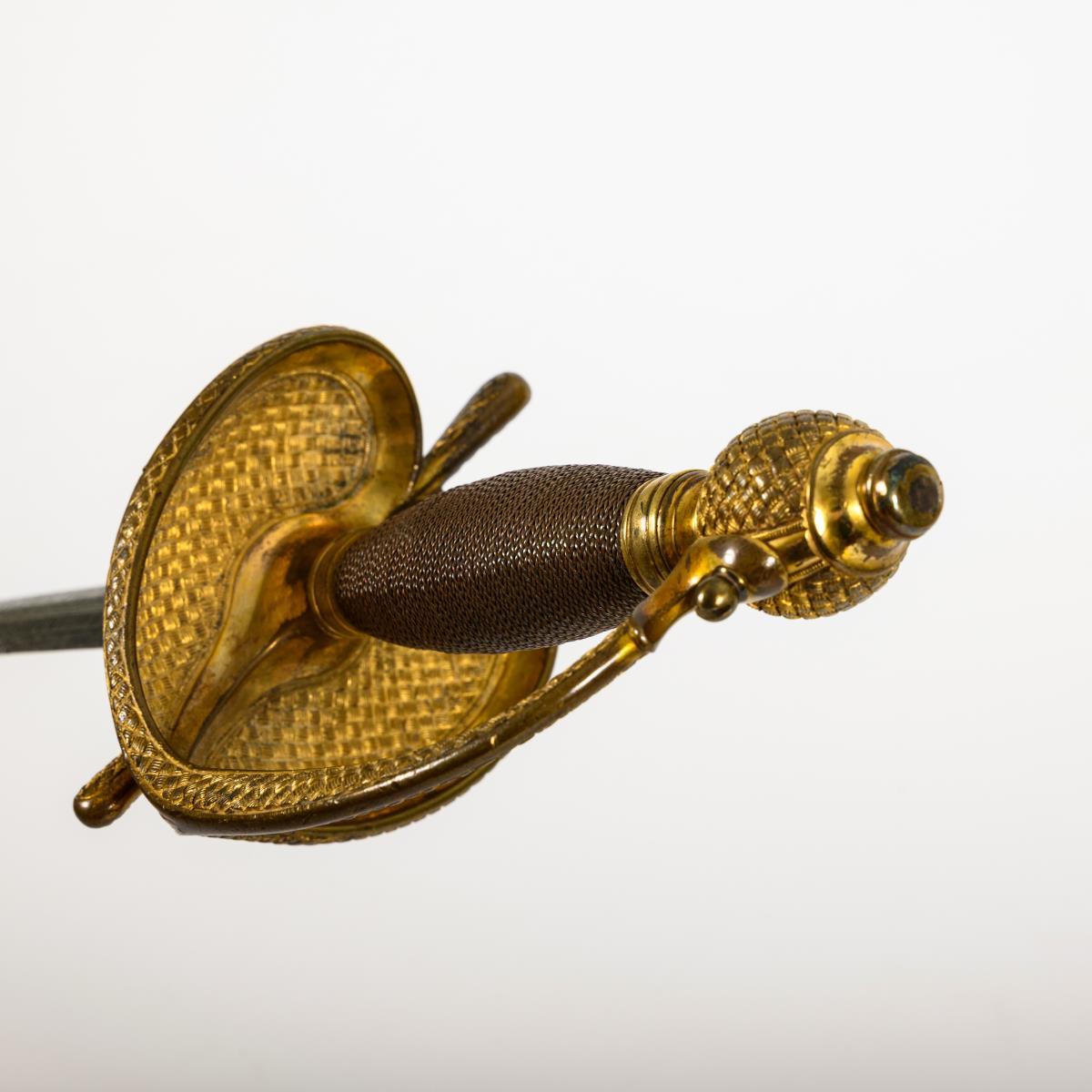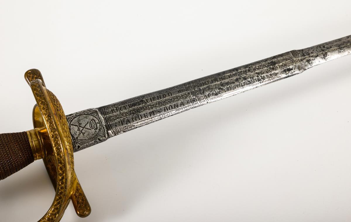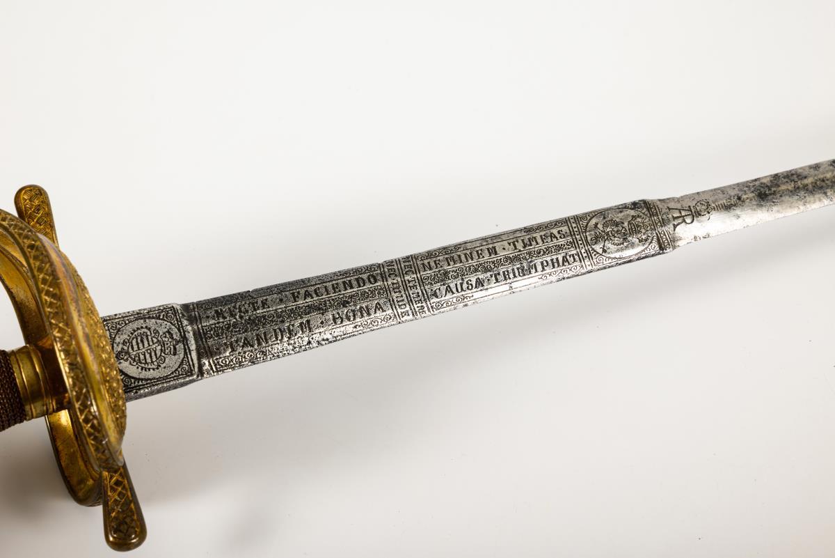 Straight double-edged, richly decorated blade. The ricasso with crossed blades and the Saxon coat of arms, each crowned by the elector's hat. The first quarter of the blade with several passages and inscribed: "Nec temere nec timide, recte faciendo neminem timeas, tandem bona causa triumphat" (partly indistinct), as well as a crowned eagle and the monogram "AR". Brass grip with fine copper wire winding. Hilt with heart-shaped guard plate in braided design..