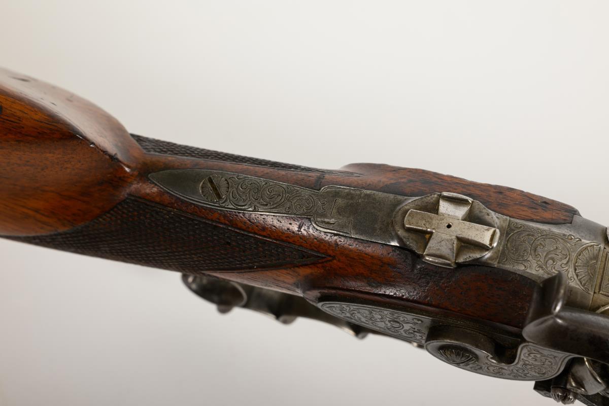 Octagonal, rifled barrel, signed. Rear sight and front sight and open sights. Trigger finely engraved with arabesques in relief with set trigger and harp grip. An ibex inlaid on the cheek rest. Muzzle, ramrod holder and butt stock compartment with pieces of staghorn. Wooden stock with age-appropriate wear marks, firing pin somewhat compressed, no function test.