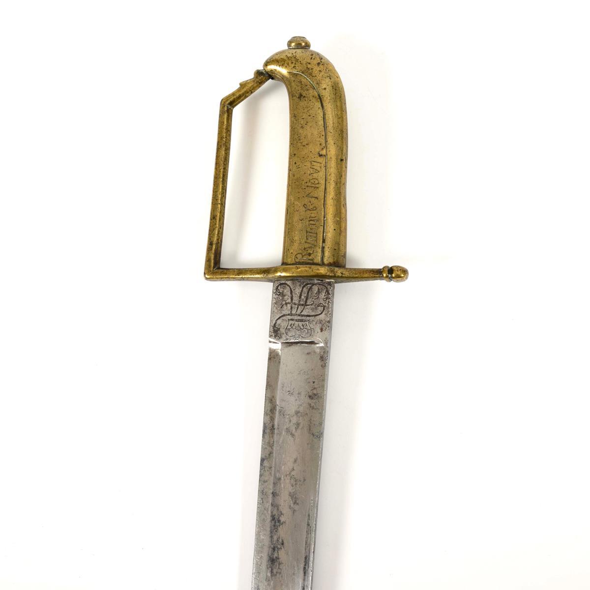 Straight, single-edged blade with a broad fuller. The ricasso bears the monogram "FA" crowned on both sides with an escutcheon. Brass grip with straight quillons and engraved "R. VIII. m. C. No VII." for 8th Infantry Regiment, 3rd Company, Weapon VII. Riveting on pommel probably replaced, monogram somewhat worn.