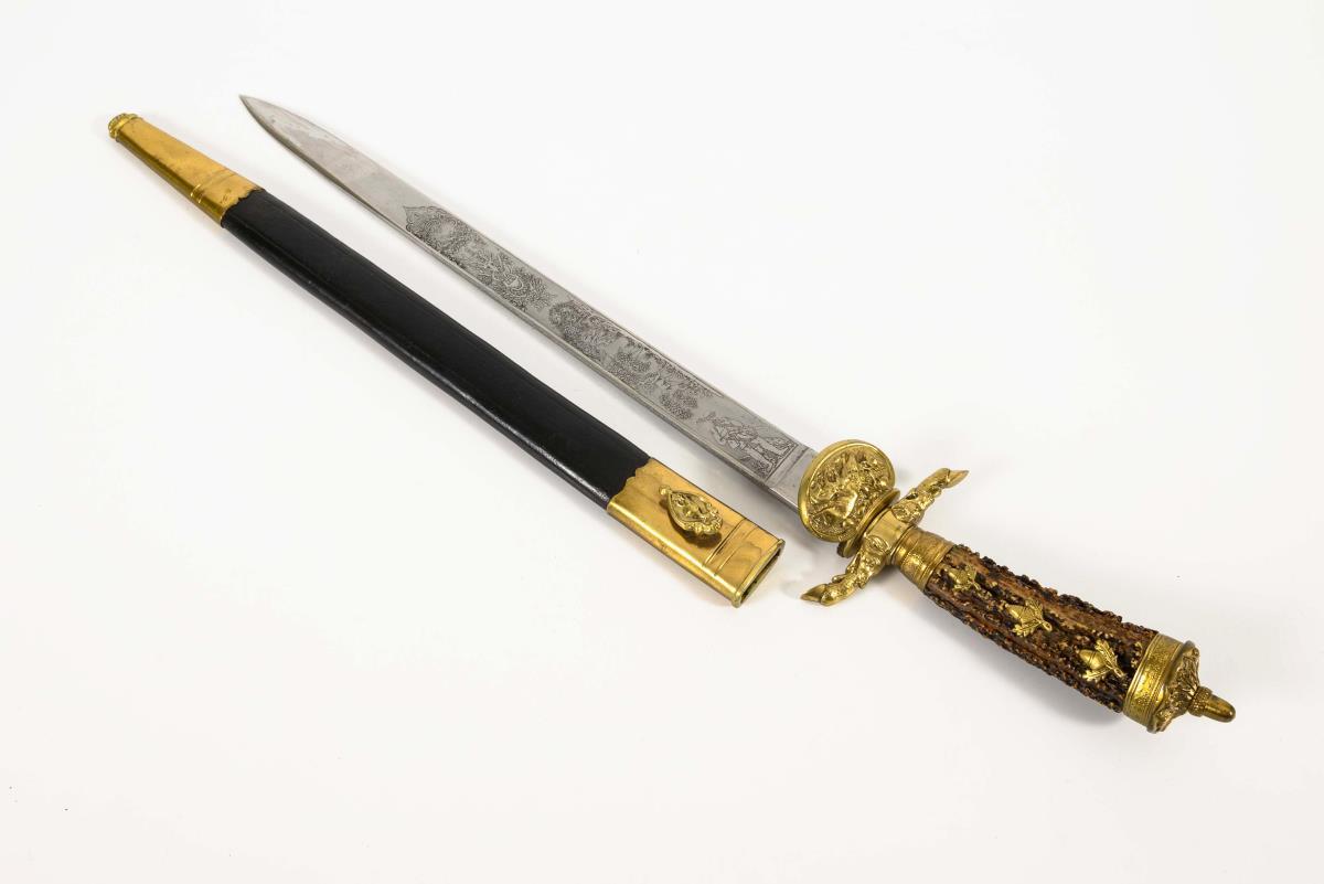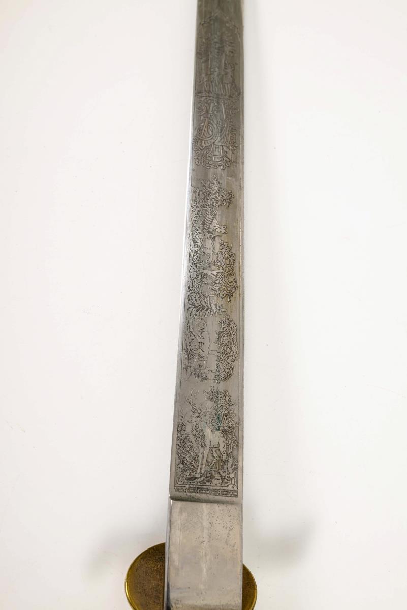 Straight, single-edged blade with a point in the midline. Richly etched depictions on both sides. Guard and quillons also with pictorial depictions. Staghorn grip with three acorn appliqués and a decorated pommel cap with acorn. Black leather scabbard with brass ferrules.