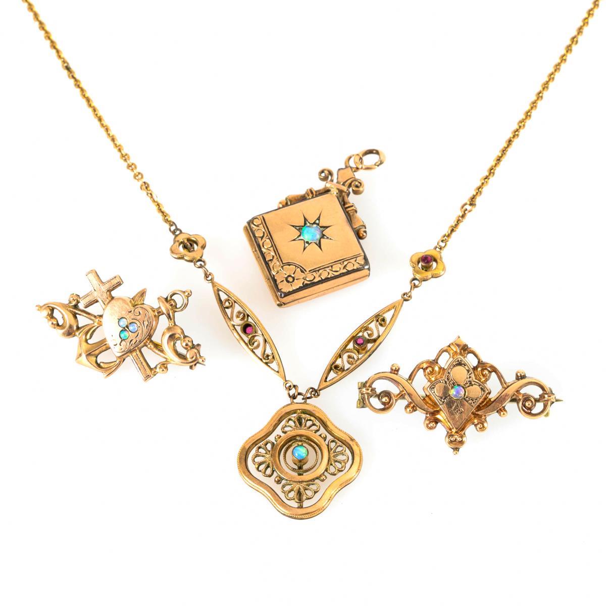 Necklace, medallion (2 inner compartments) and 2 brooches in relief with small opal cabochons. Anchor chain with pin clasp.