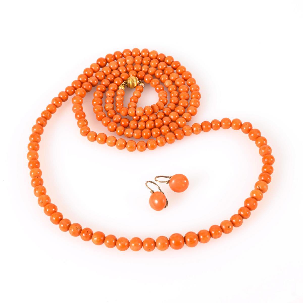 Long coral necklace and pair of earrings.