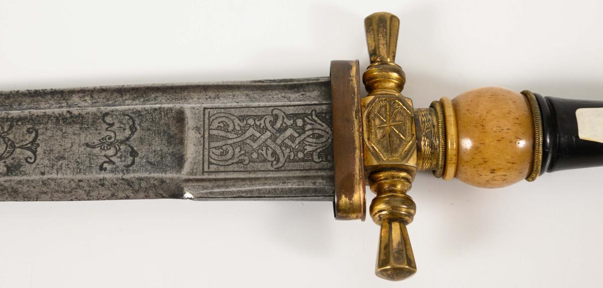 Straight single-edged blade, double-edged at the point, with a point and broad fuller in the midline, as well as a narrow fuller on the back. Large ricasso, baroque ornamentation with a bird, straight, jointed quillons. Grip divided into two parts of light and dark wood.