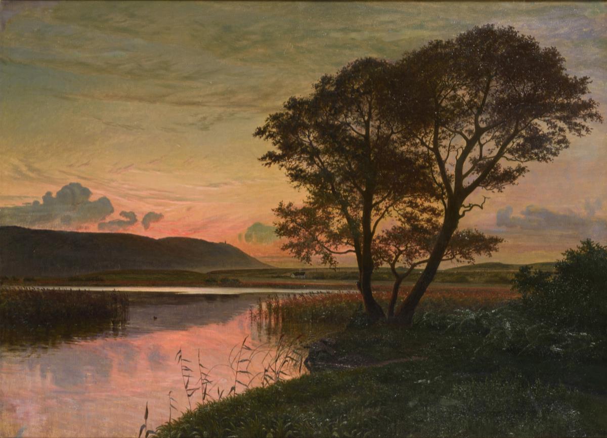 Abendlandschaft. Öl/Leinwand, rechts unten signiert/datiert: 1910. Stimmungsvolle weite Landschaft mit einem Haus nahe dem Fluss und der untergehenden roten Abendsonne, die bereits hinter den Bergen verschwunden ist. Altersspuren. 60 x 83 cm, schwarzer Lackrahmen 79 x 101 cm. Th/B.: Dänischer Maler und Architekt (1853 Skælsk¢r - 1930 Kopenhagen).