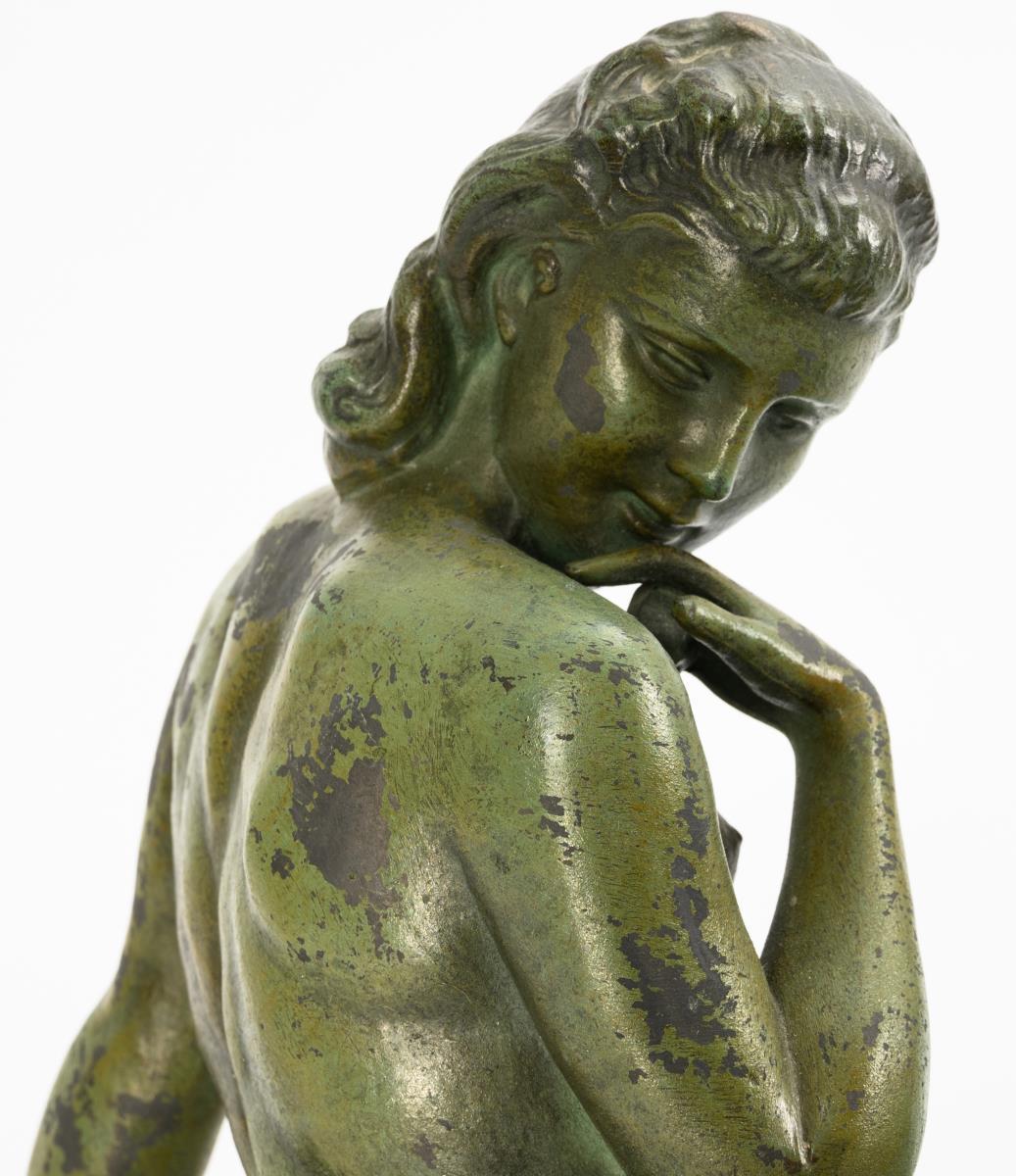 Metal cast, painted green, black marble plinth. Marked. H 25 cm, total 28 x 55 x 16 cm. 12.7 kg.