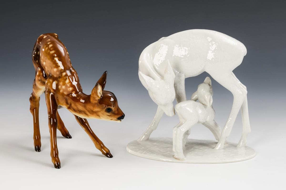 1x ROSENTHAL, 1944, model no. 1638, design by Rudolf Rempel (1892-1970), marked: Doe with fawn (H 15 cm). / 1x HUTSCHENREUTHER, 2nd half 20th century, design by Hans Achtziger (1918-2003), monogrammed: standing fawn (H 14 cm).