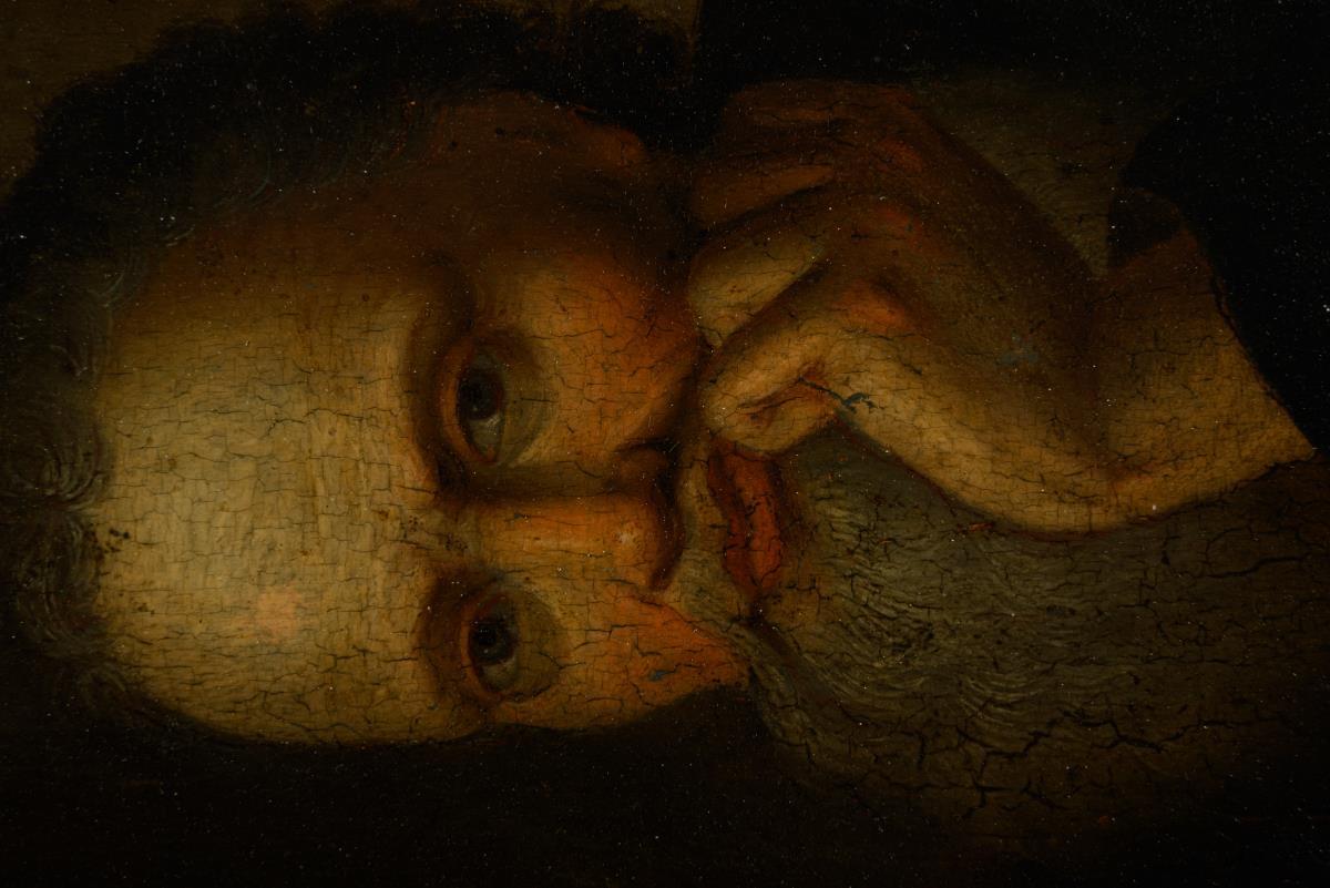Portraits of two elderly men with books and in antique-style clothing. Slight traces of age.